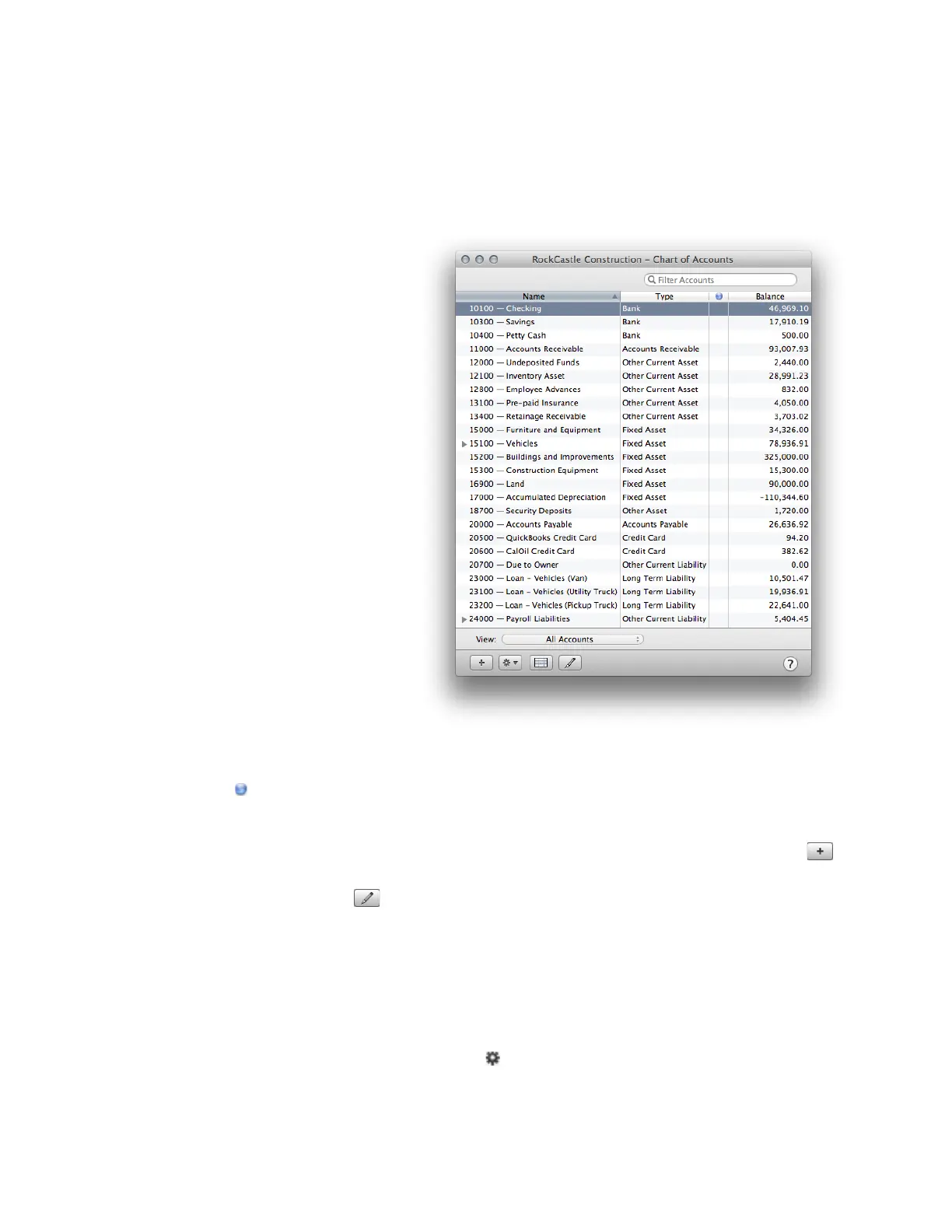 • To add an account. Click + at the bottom of the Chart of Accounts and enter information for the account.