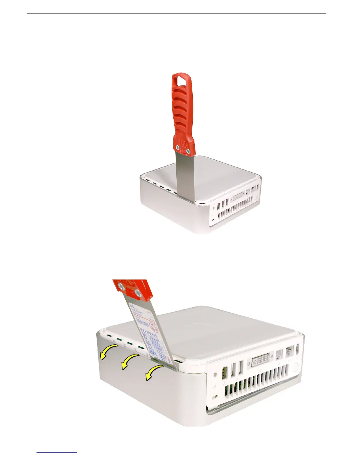 8. Hold the putty knife with the beveled edge facing the bottom housing. Insert the tool