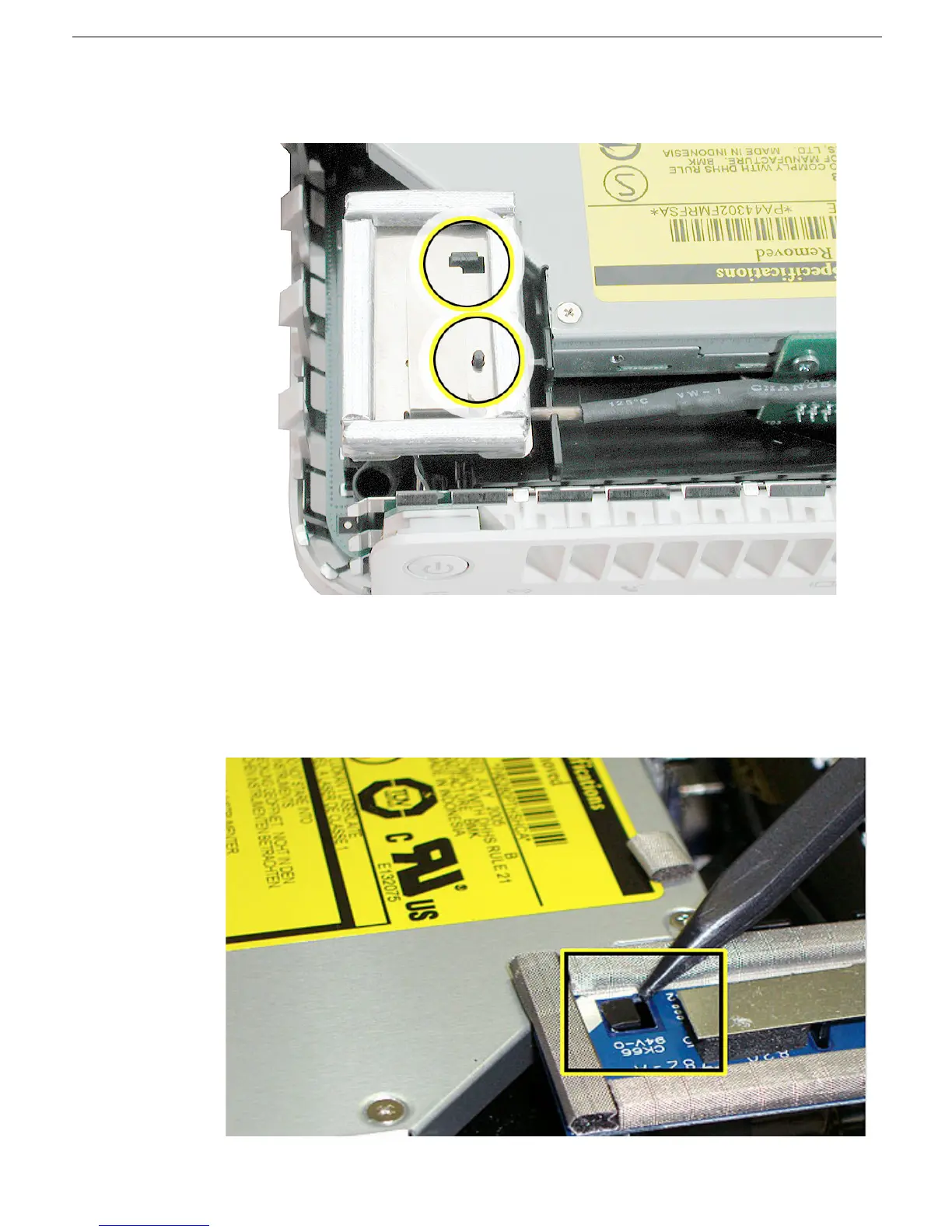 26. Lower the AirPort Extreme antenna over the black post and the clip (circled below) on