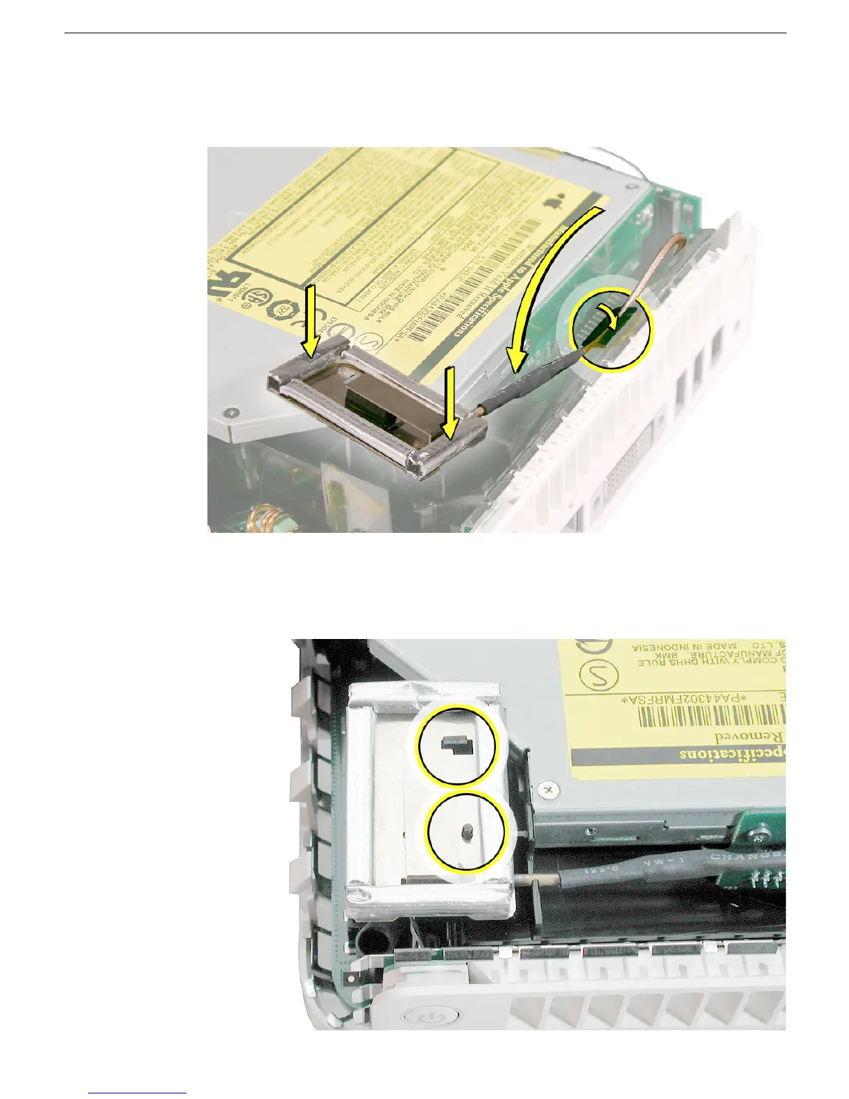 14. Lower the AirPort Extreme antenna over the black post and the clip (circled below) on