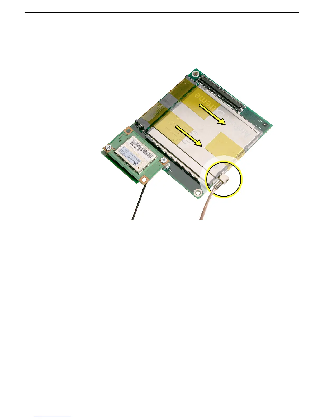 antenna cable (circled) from the AirPort Extreme card. Remove the kapton tape that