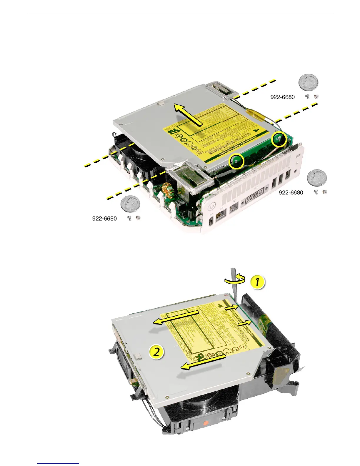 1. Using a jeweler’s #0 Phillips screwdriver, remove the four optical drive screws and the