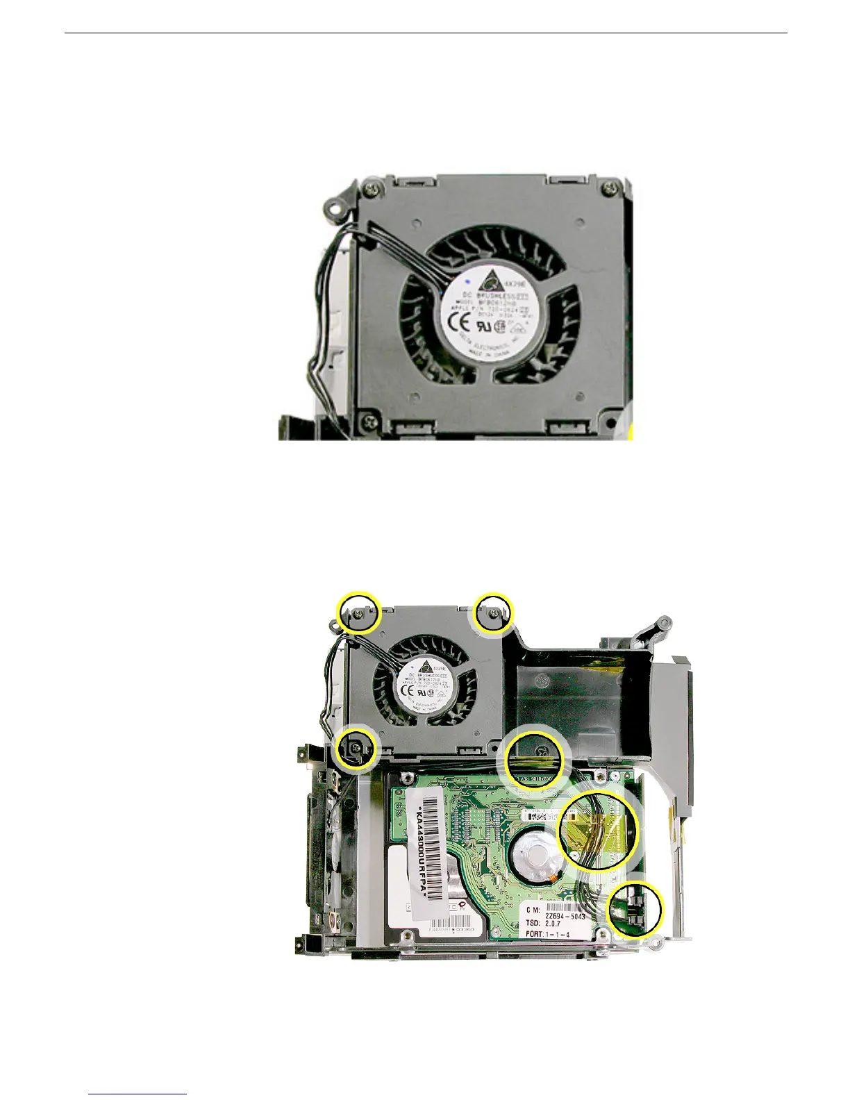 3. Replace three fan screws, the kapton tape, and connect the fan cable (on the right) to