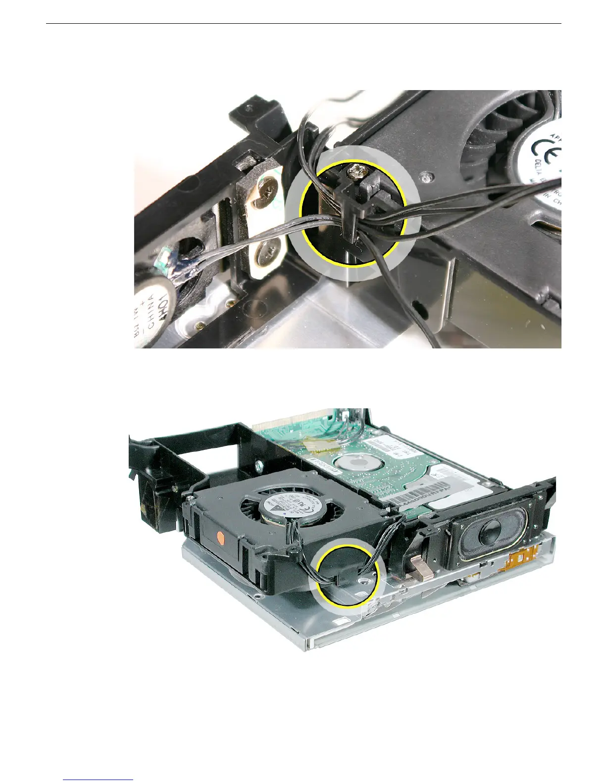 5. Route the fan cable under the clip on the outside of the internal frame.