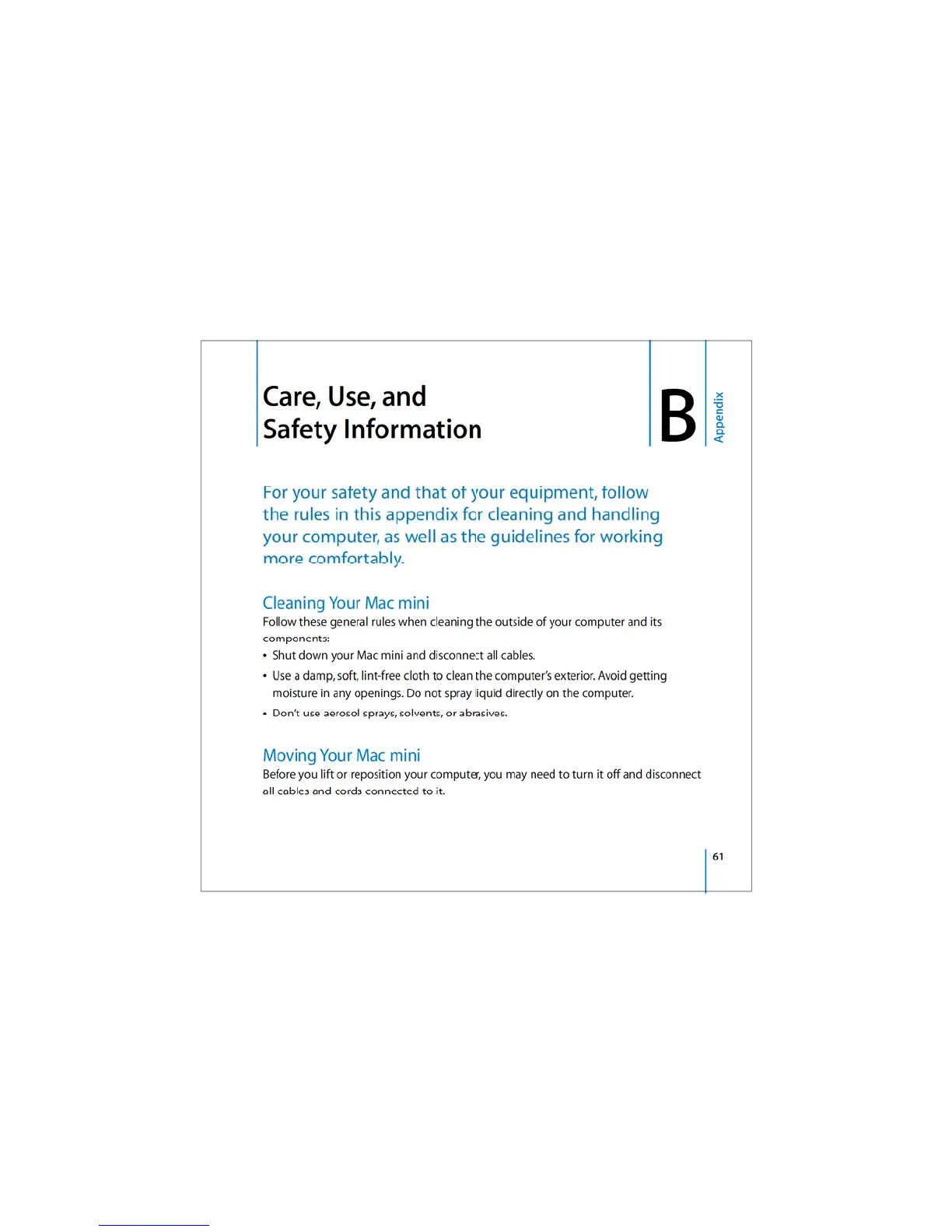 Apple Mac mini - Appendix B: Care, Use, and Safety Information; Cleaning and Moving Your Mac mini
