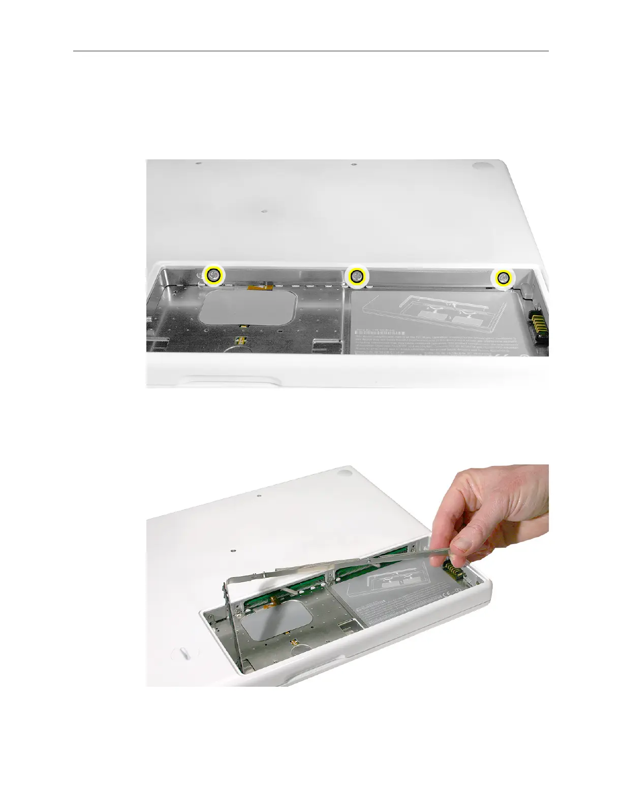 Holding the long end of the L-shaped RAM door, pivot it out from the battery bay. If 2.