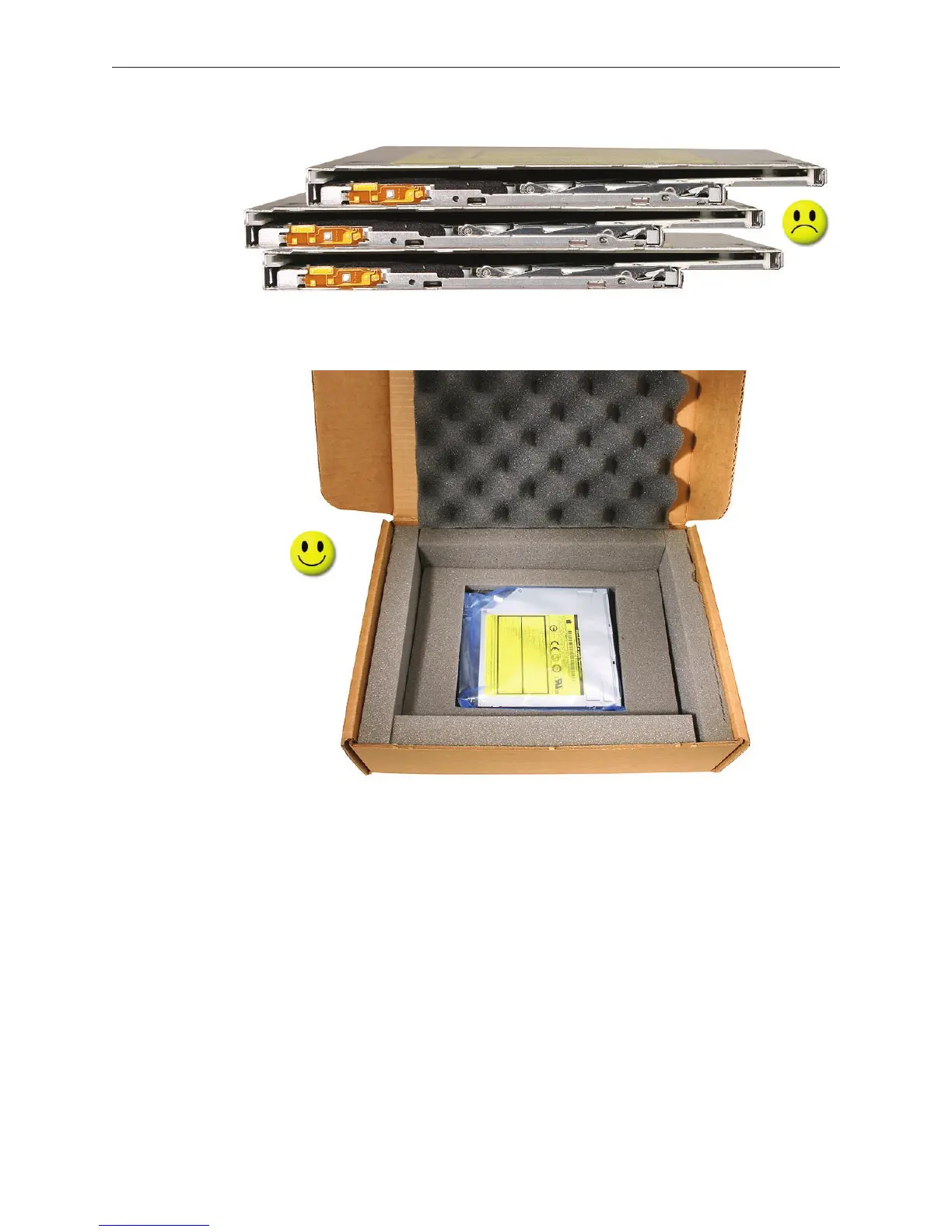 When storing optical drives, use approved packaging boxes. Never stack loose drives.