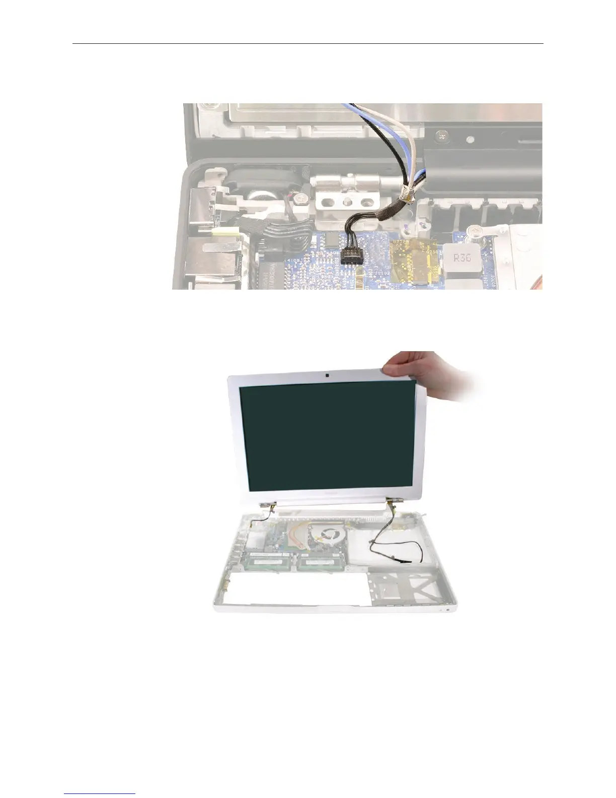 Near the left hinge, disconnect the inverter cable. (Late 2006 model is shown here.)