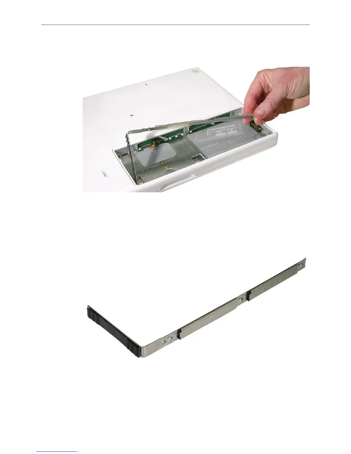 Holding the long end of the L-shaped RAM door, pivot it out from the battery bay. (If