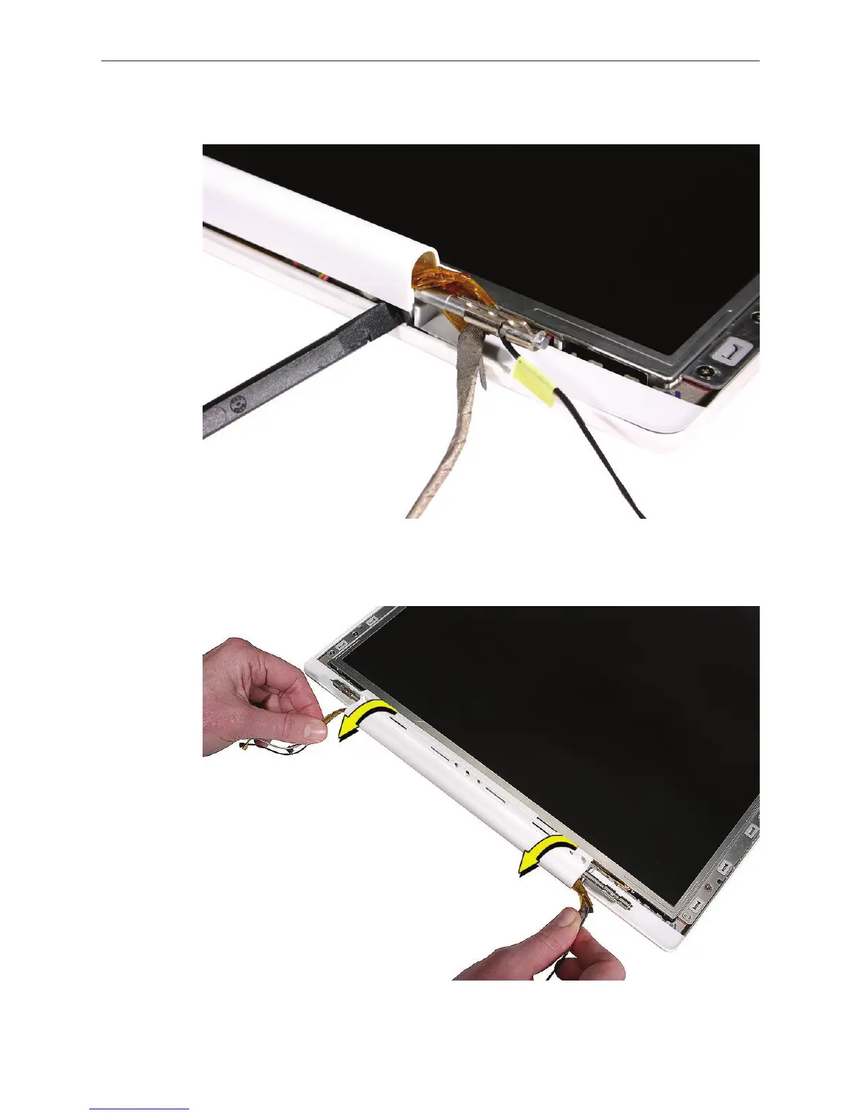 Holding the bundled display cables at each end of the clutch cover, carefully unwrap them