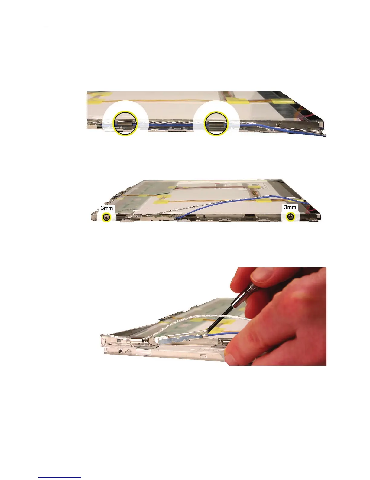 Remove the two identical screws that secure the right bezel brace to the LCD panel.