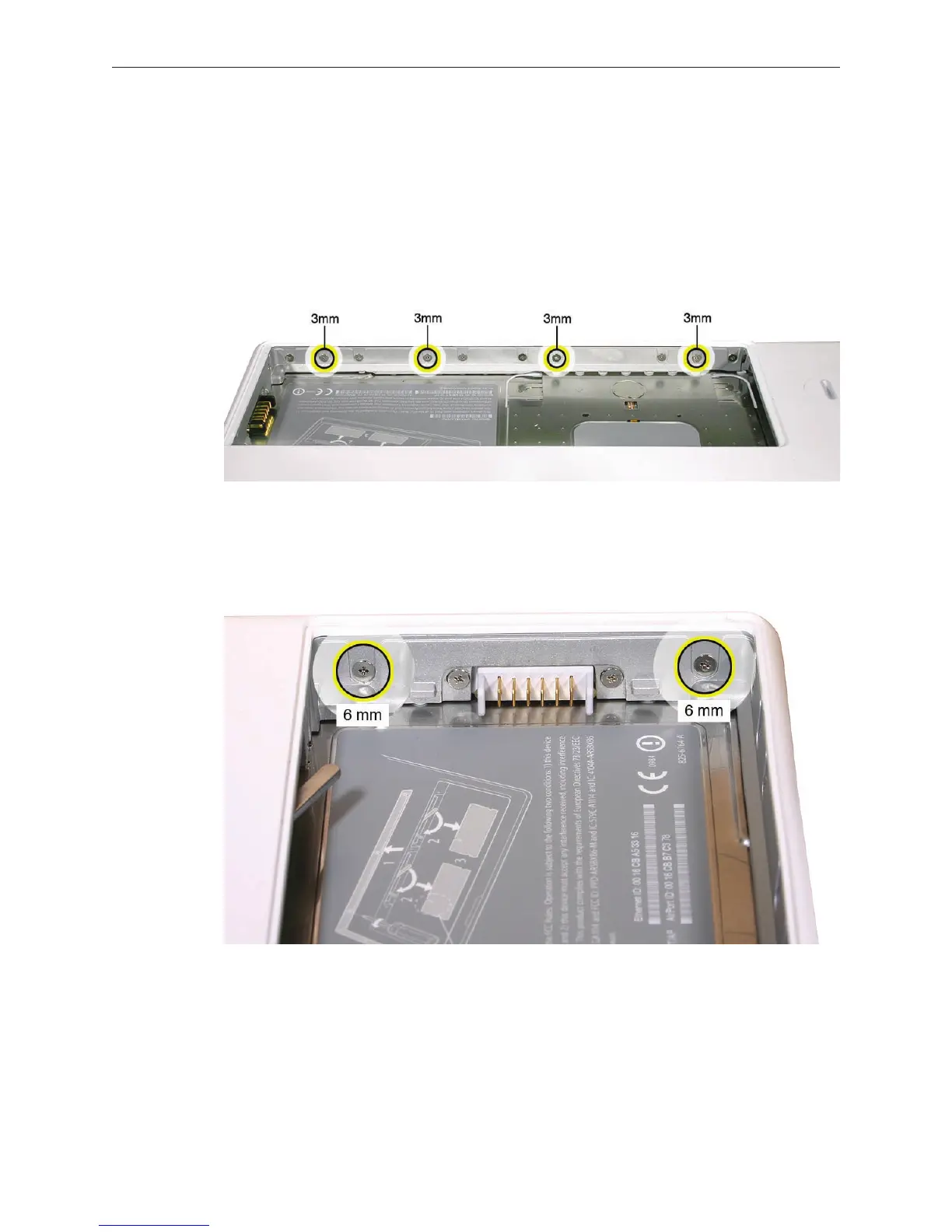In the battery bay, remove the two 6-mm long identical screws that are on both outer sides