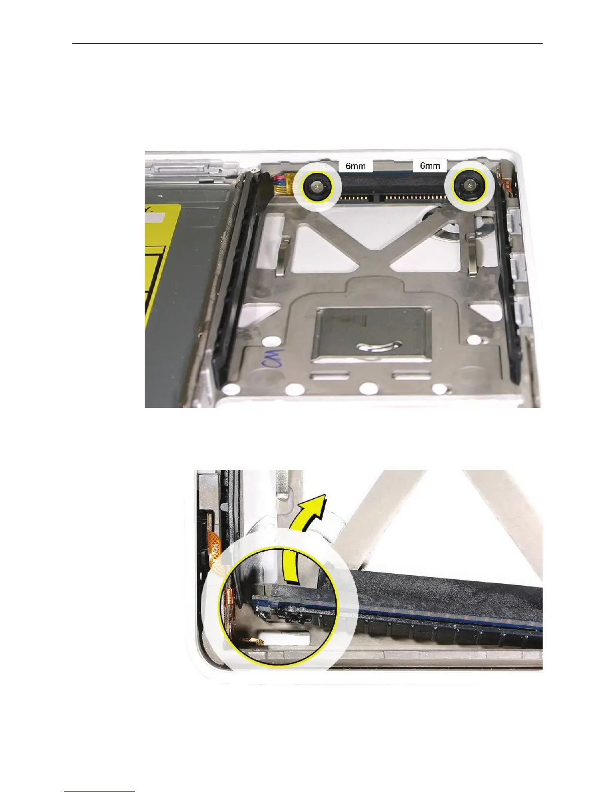 Remove the two 6-mm long screws from the hard drive connector at the right front side of
