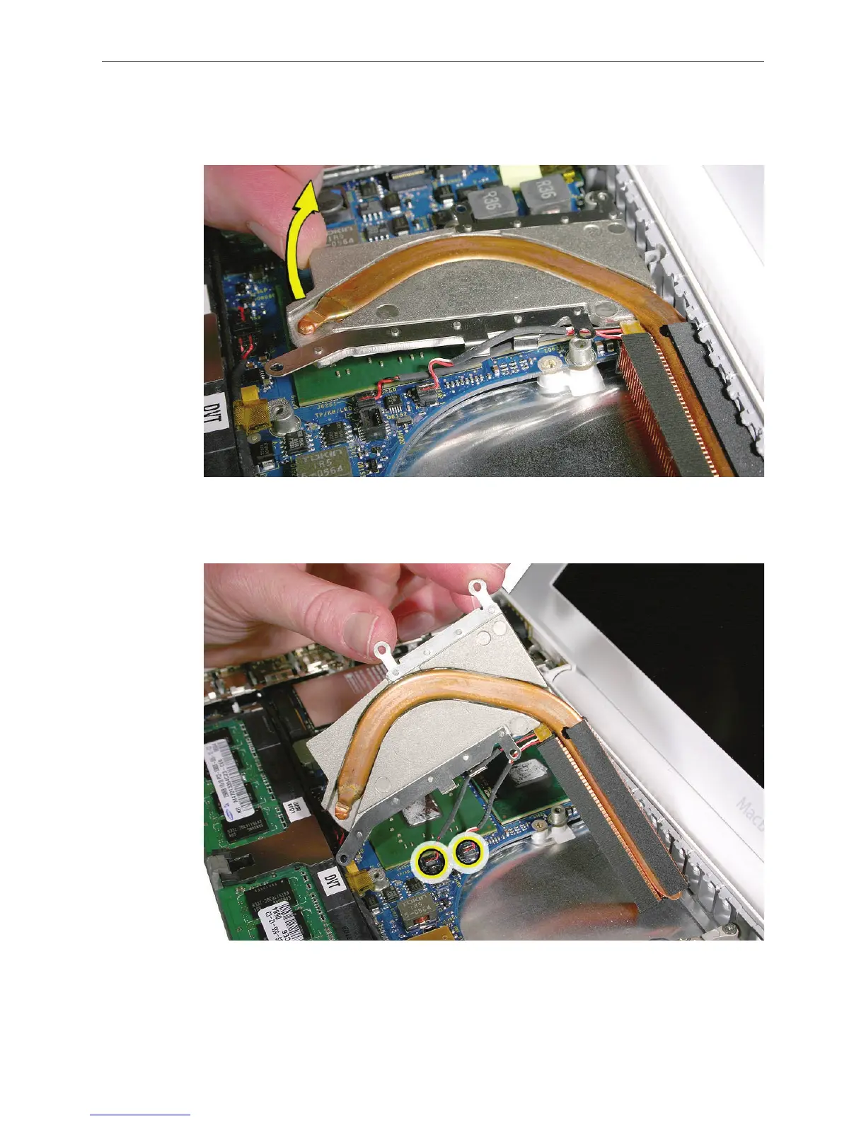 Holding the heatsink by its edges, tilt it up and disconnect the two thermistor connectors