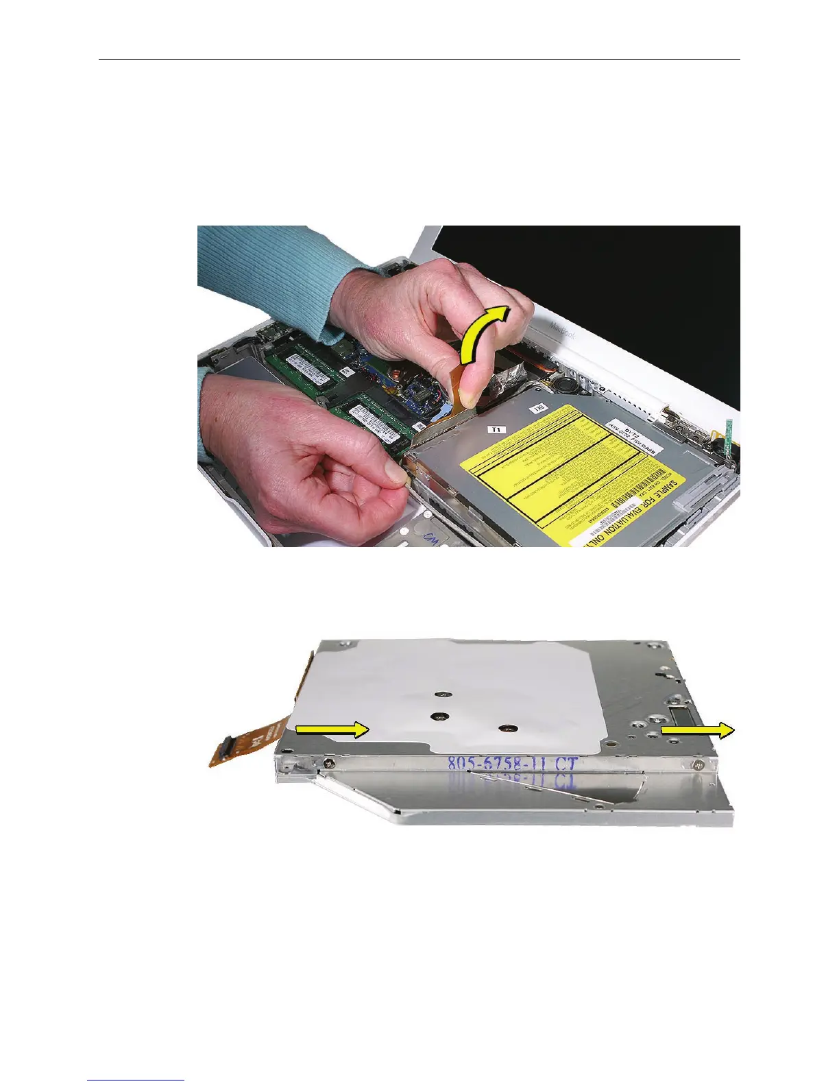 Grasp the optical drive ex cable and use it as a pull tab as you tilt up the optical drive. Be
