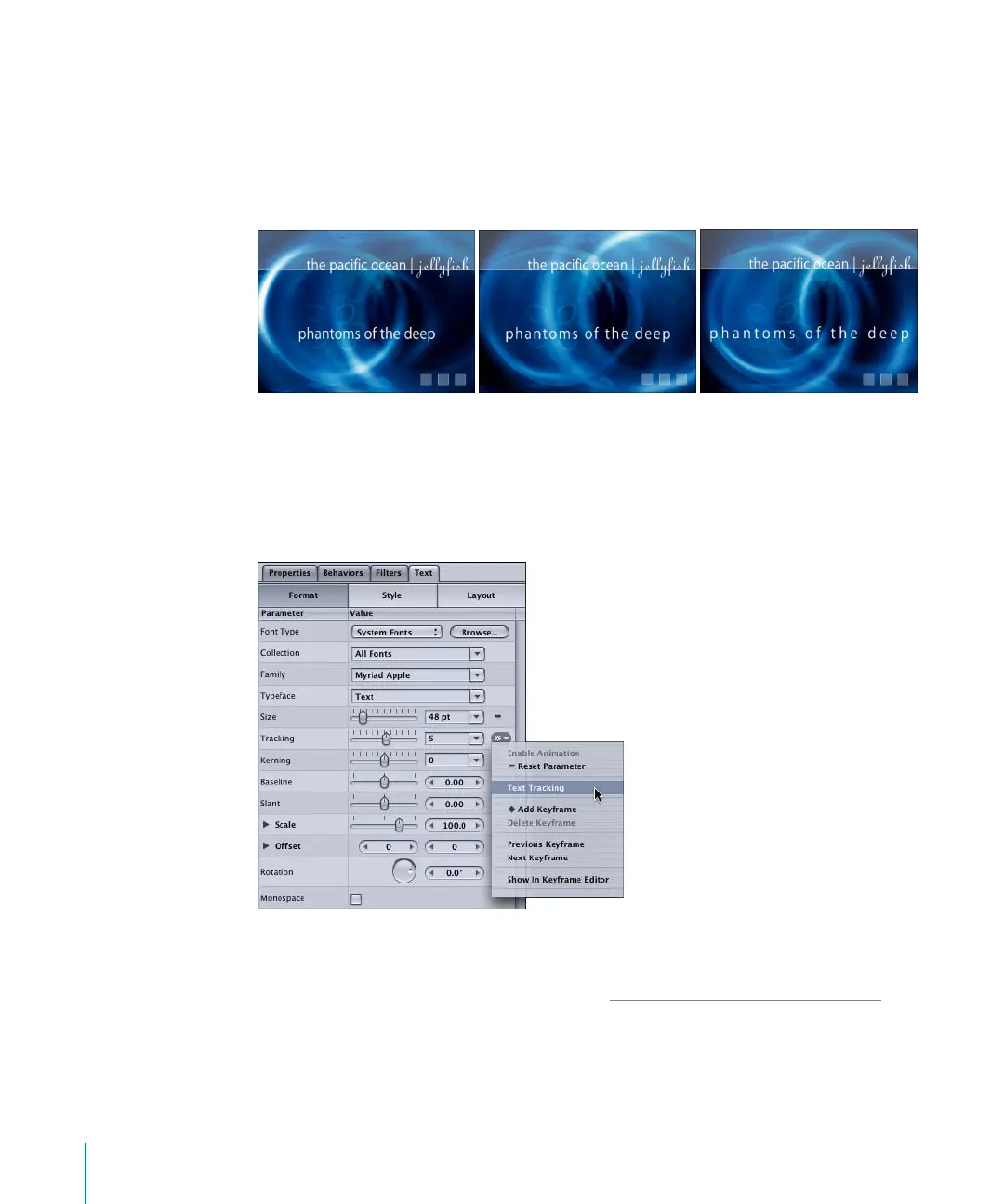 animated Tracking values are visible in the Format pane of the Inspector. The behavior
