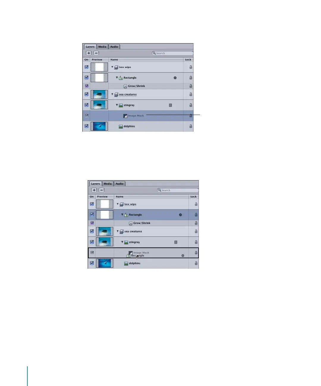 • In the Layers tab, drag the name of the shape that you want to use as a mask to the