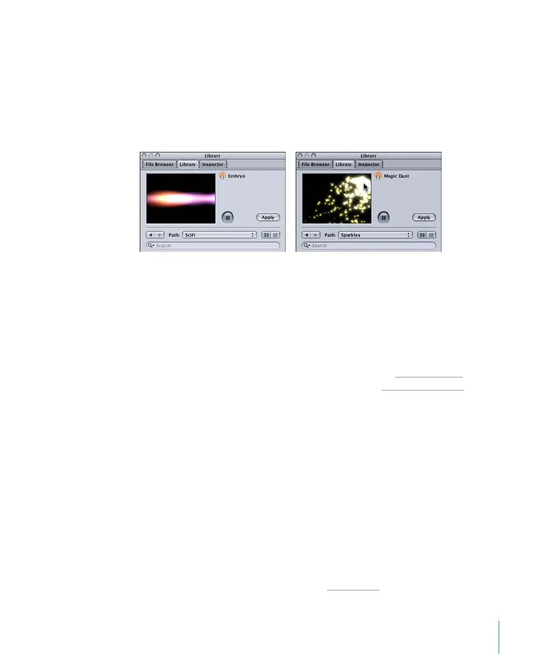 example, in the Particle Emitters category, click a preset in the Library stack to play the