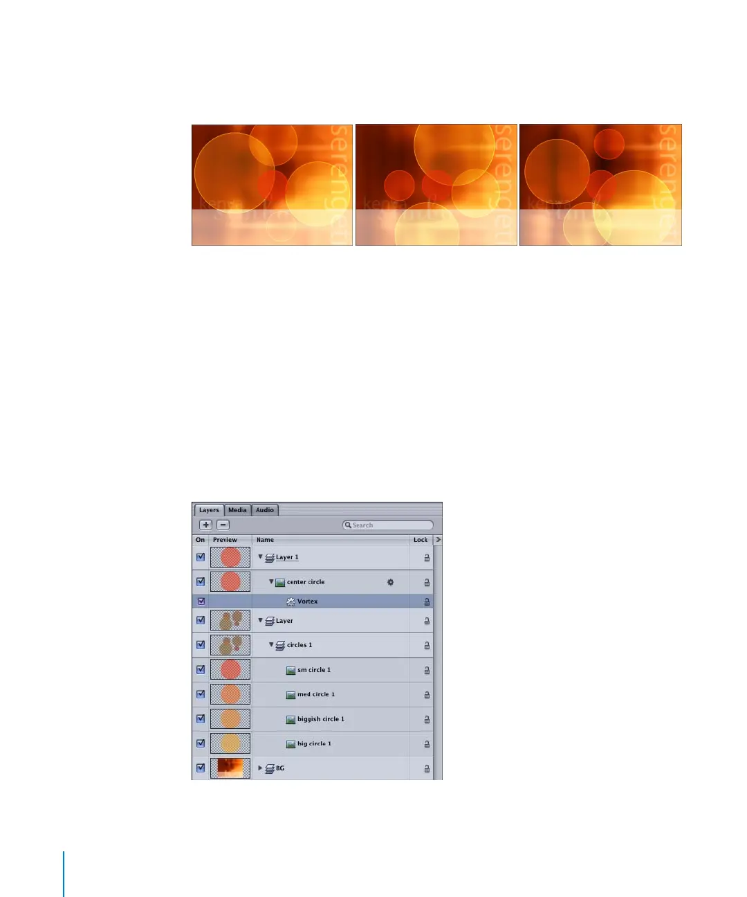 this step, the Vortex is applied to the “center circle” object in the layer above the group