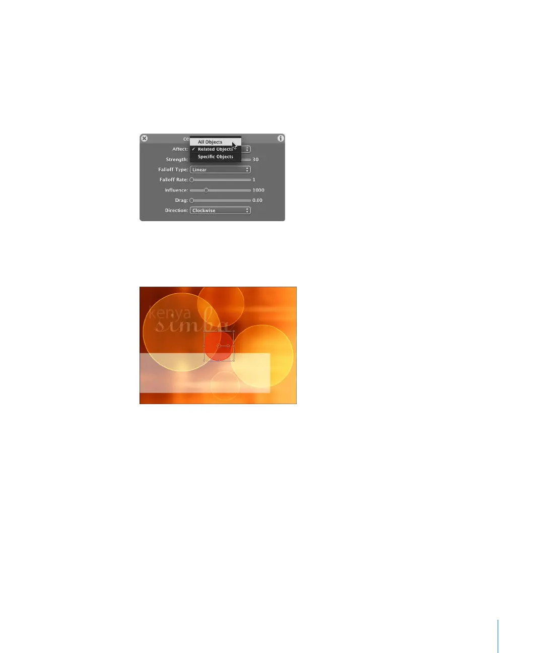 By default, Related Objects is selected in the Vortex Affect parameter. Because the circle