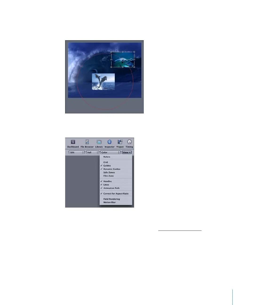 appears in red and forms a perfect circle around the lower dolphin object.