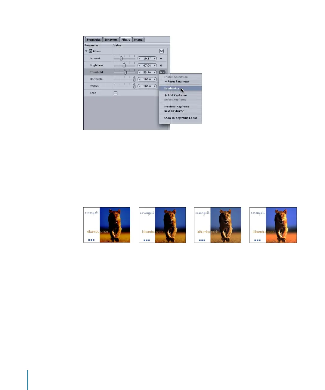 are randomly animated. In the Filters tab, you can see the keyframed Brightness value