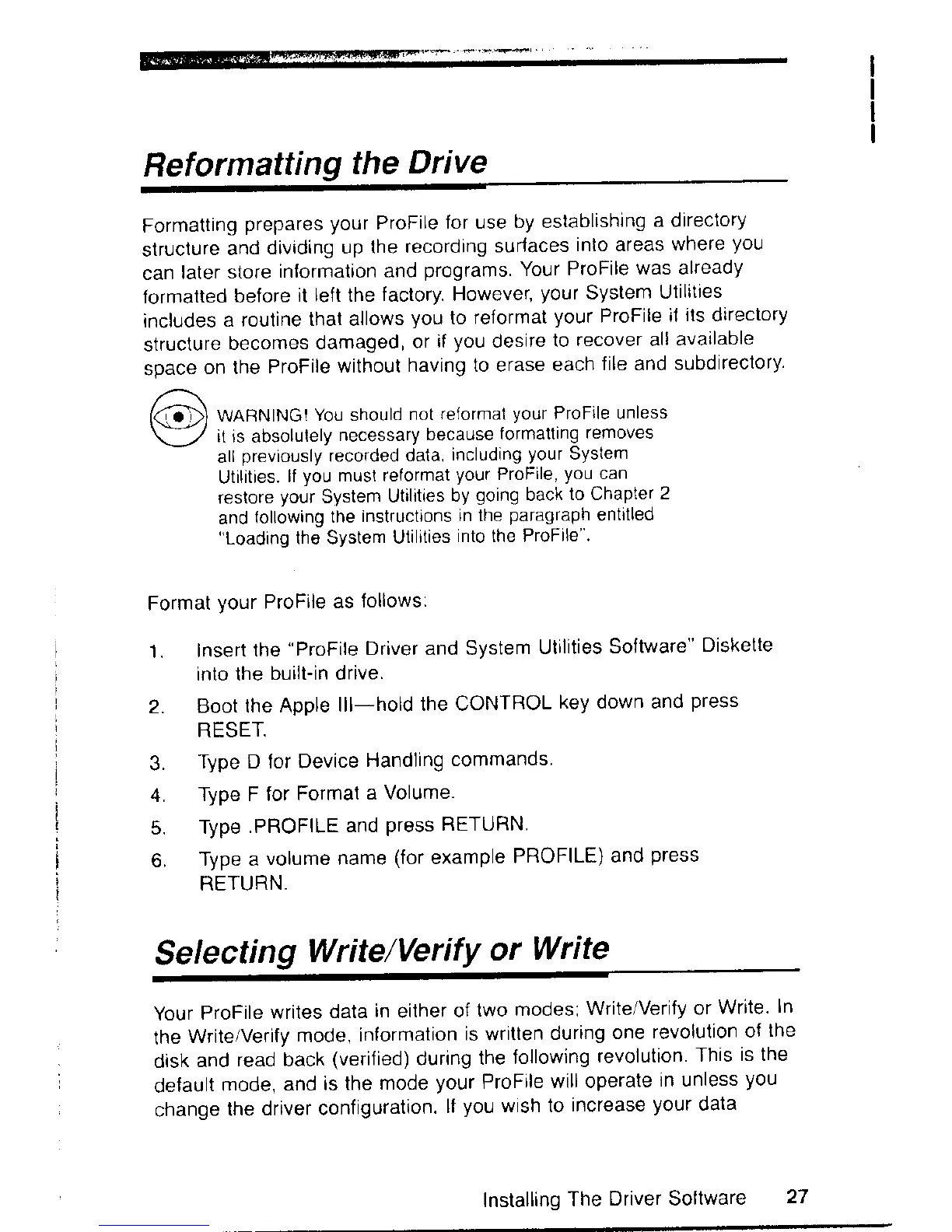 Apple profile - Reformatting the ProFile Drive; Selecting ProFile Write Modes