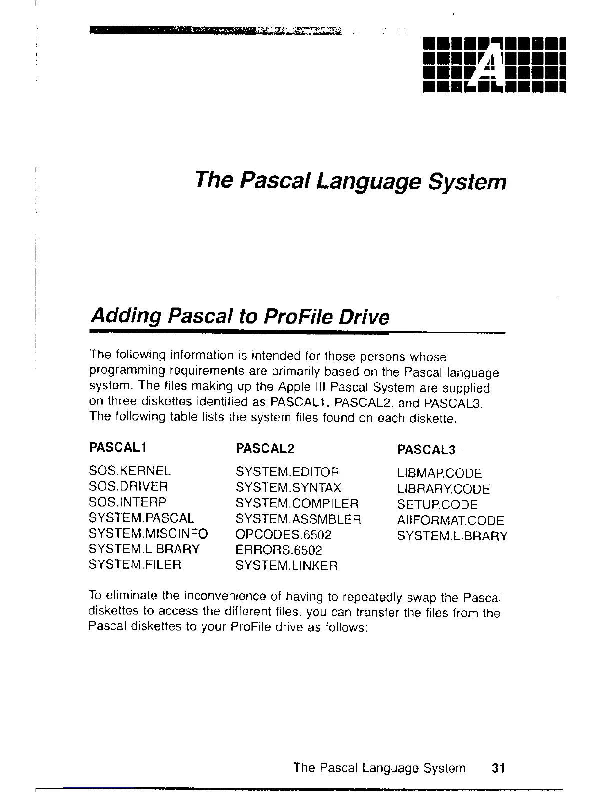 Apple profile - The Pascal Language System; Adding Pascal to ProFile Drive