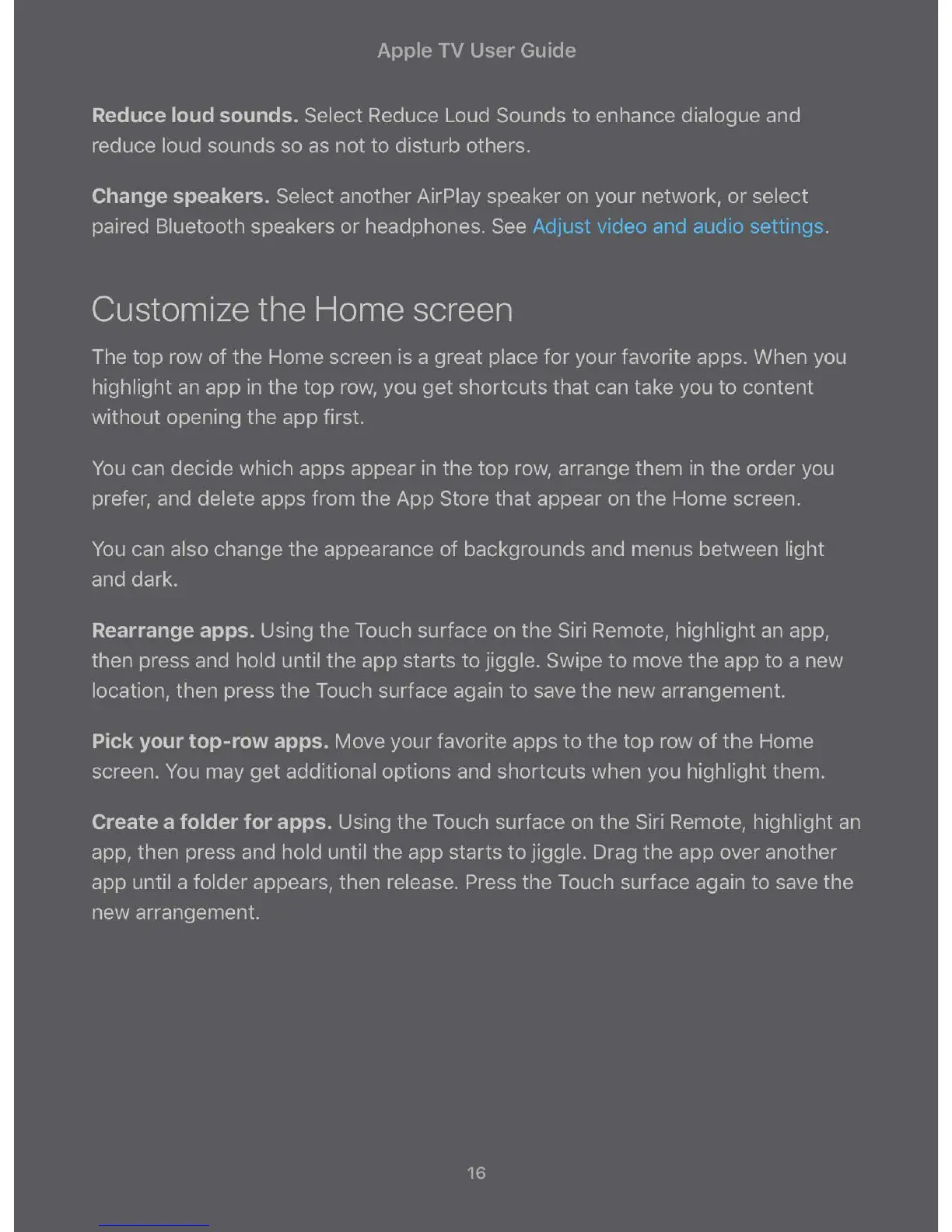 Create a folder for apps. Using the Touch surface on the Siri Remote, highlight an