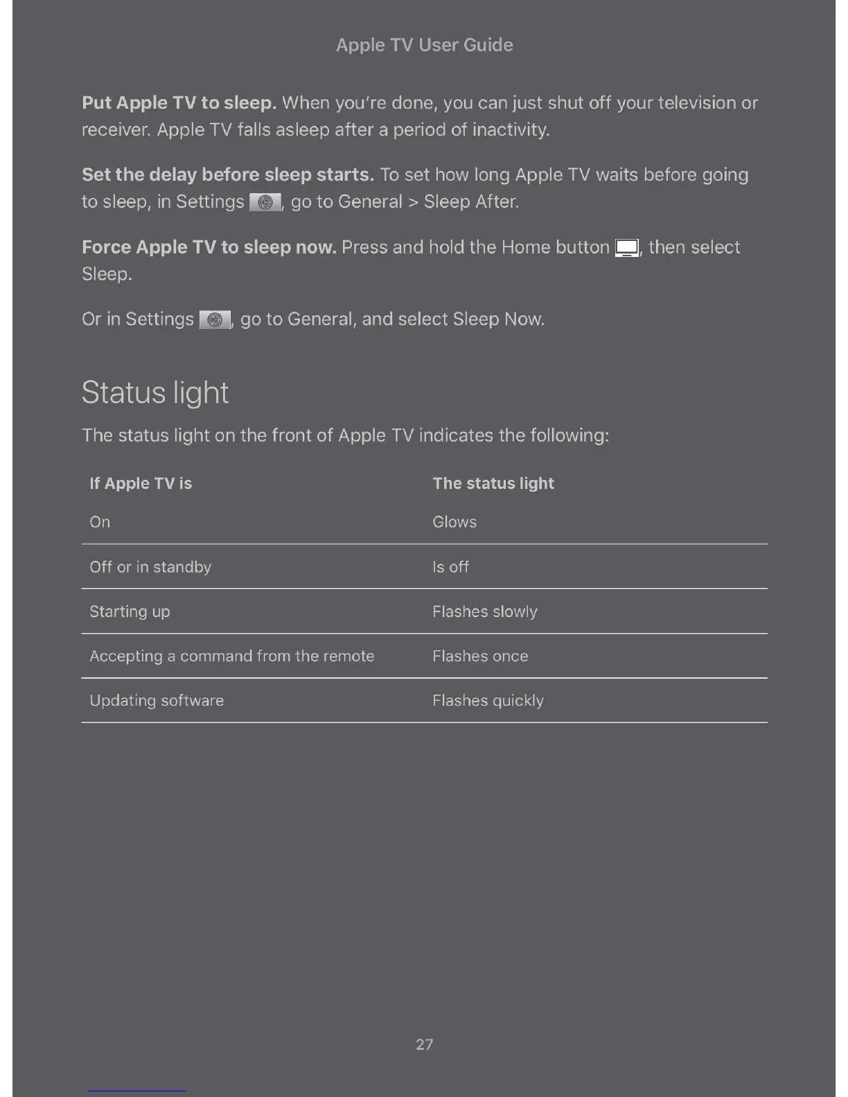 Apple TV - Powering Apple TV On and Off; Sleep and Wake Functions; Status Light Indicators