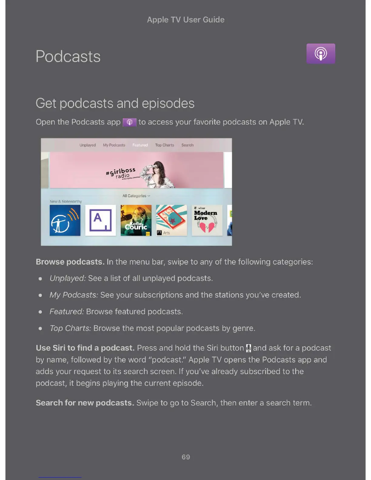 Apple TV - Podcasts App Features; Finding and Browsing Podcasts; Siri for Podcast Search