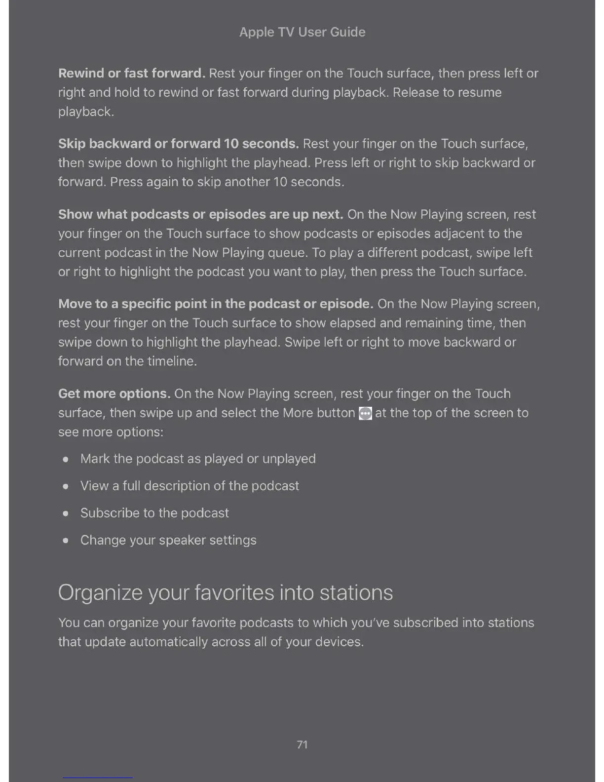 or right to highlight the podcast you want to play, then press the Touch surface.