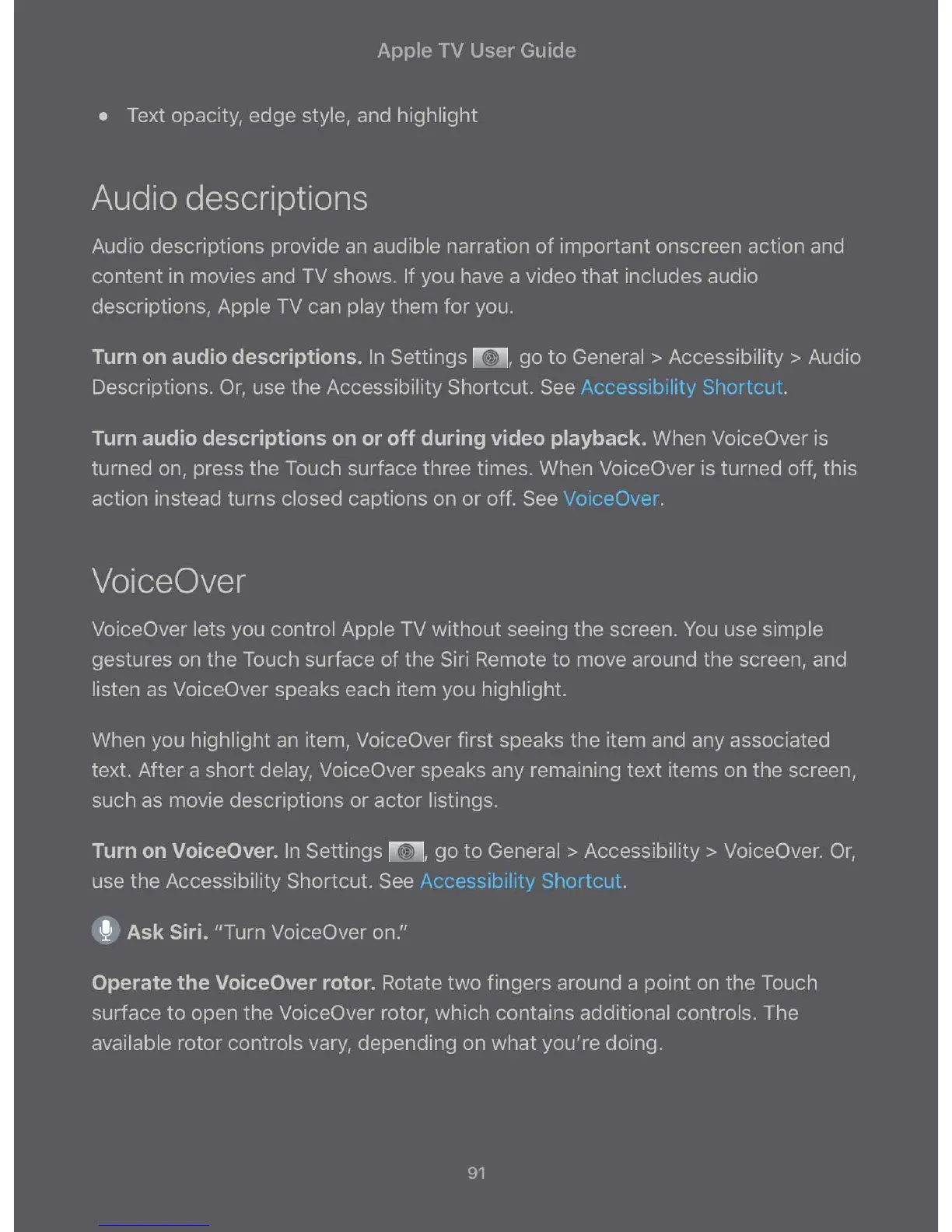 Turn audio descriptions on or off during video playback. When VoiceOver is