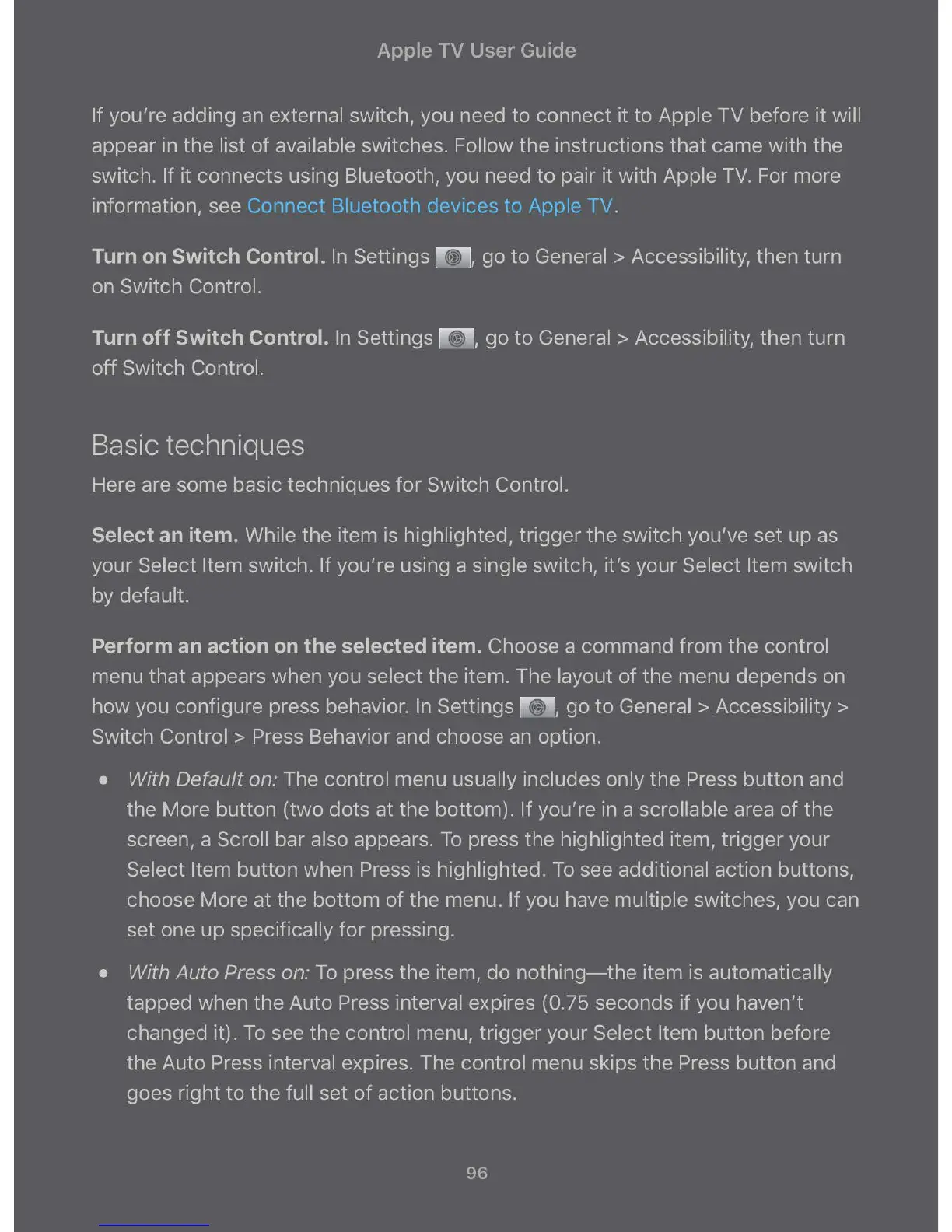 Turn on Switch Control. In Settings R, go to General > Accessibility, then turn