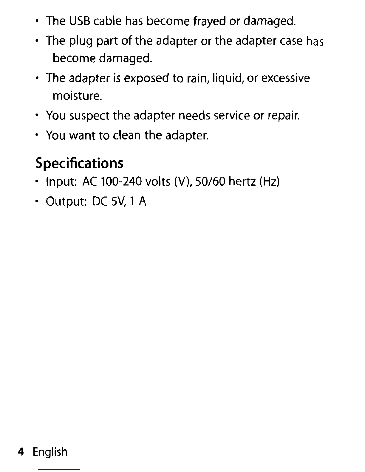 Apple USB Power Adapter - Service and Maintenance Conditions; Specifications; Technical Specifications