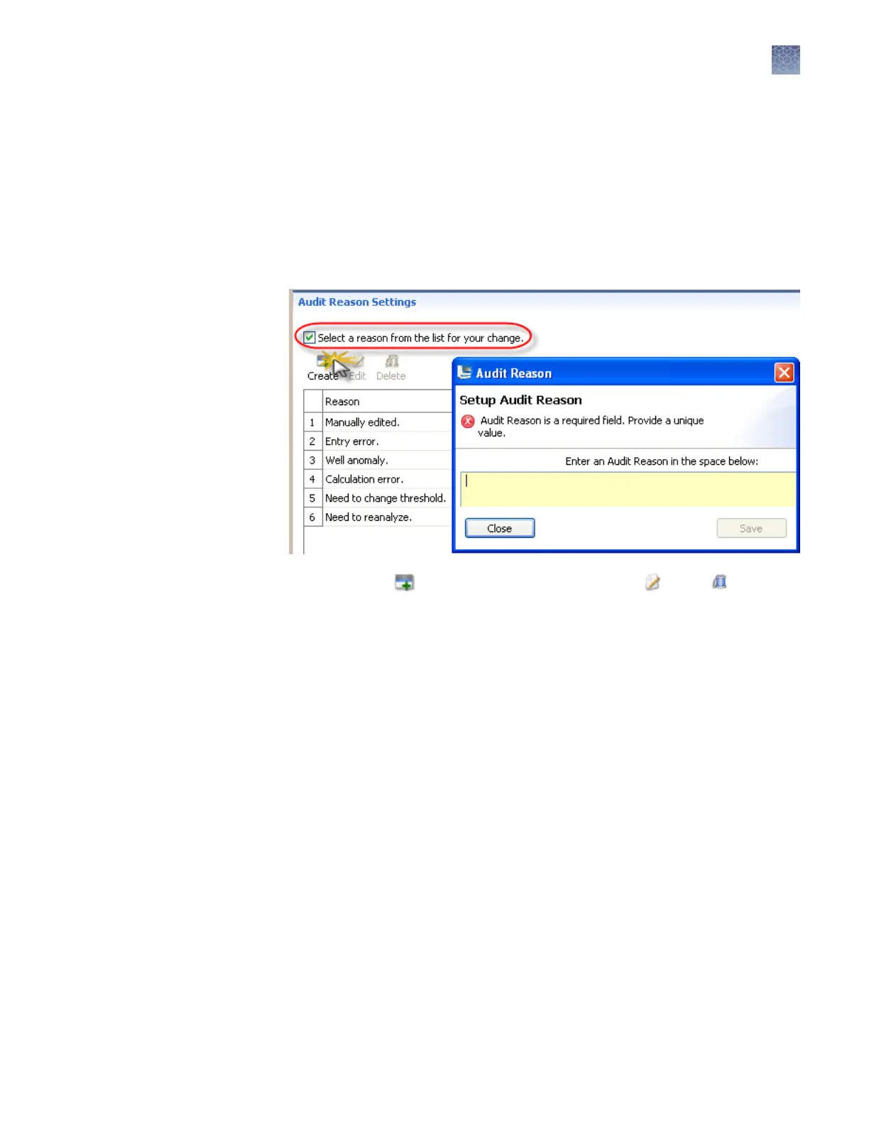 Audit Reason dialog box (displayed when a user performs an audited action).