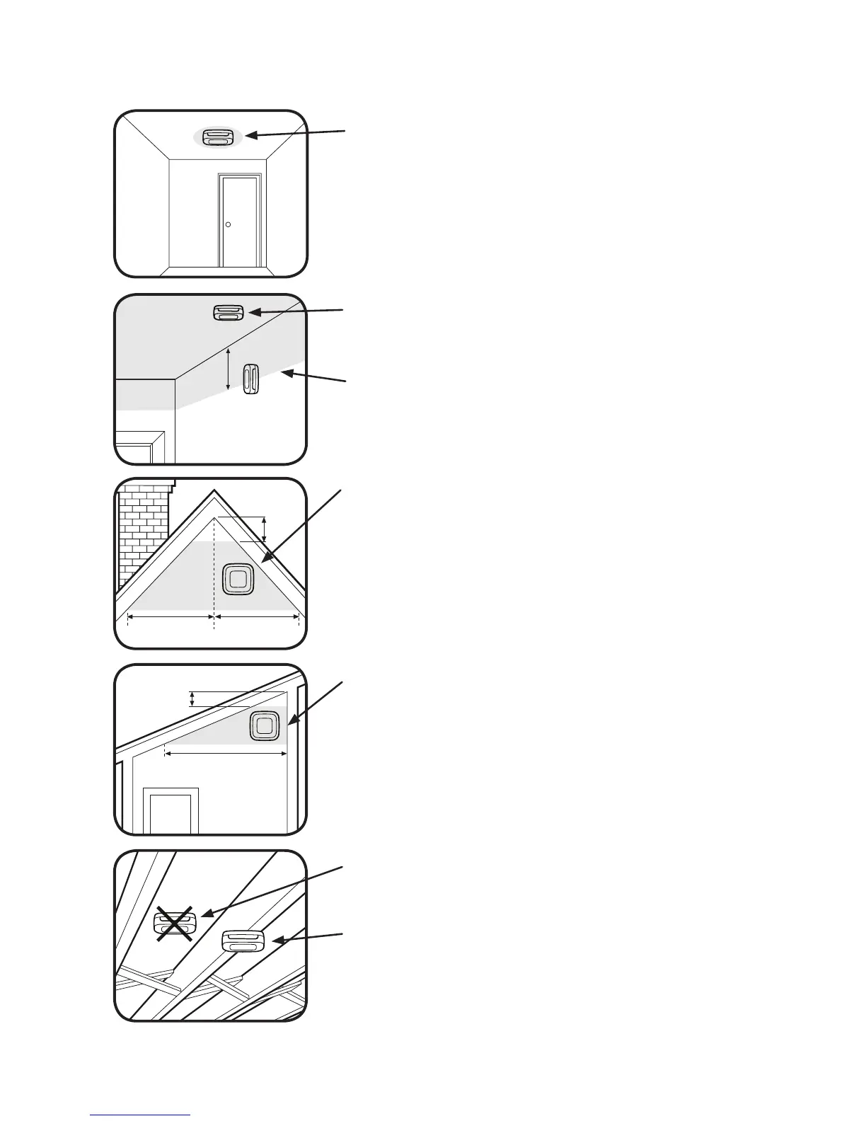 On peaked ceilings or roofs, mount at least 4”