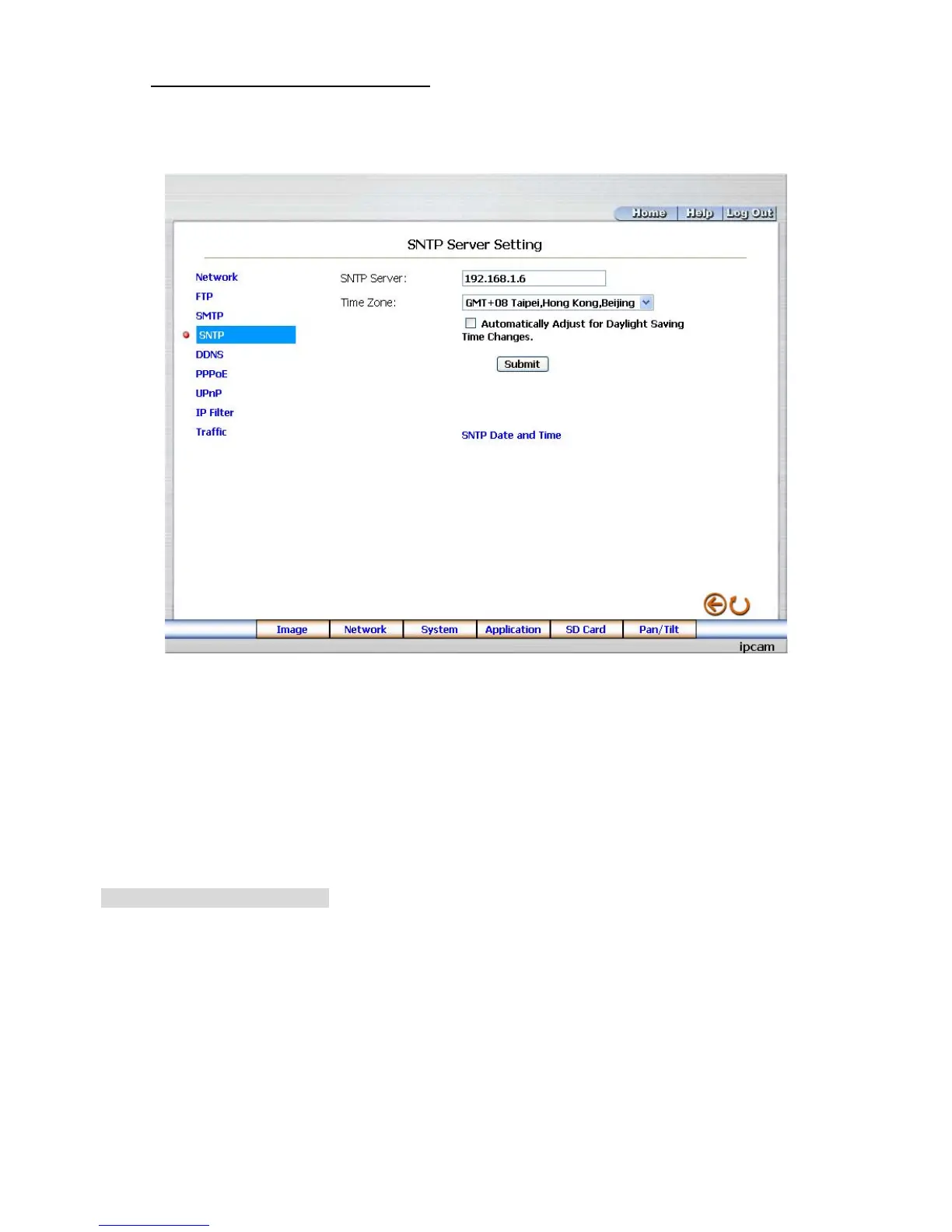 Submit: Click to submit the new SNTP setting to the IP camera.