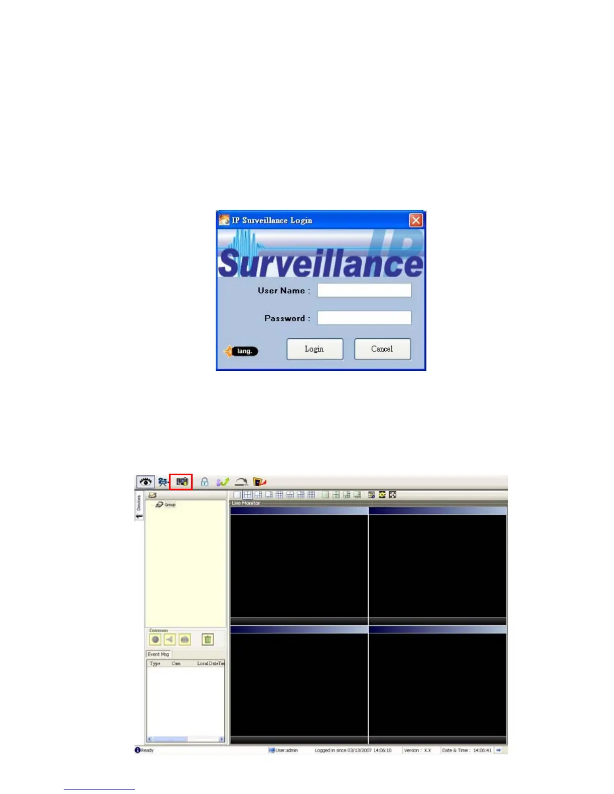 Once the IP surveillance is executed, a Login prompter will appear. You must enter the