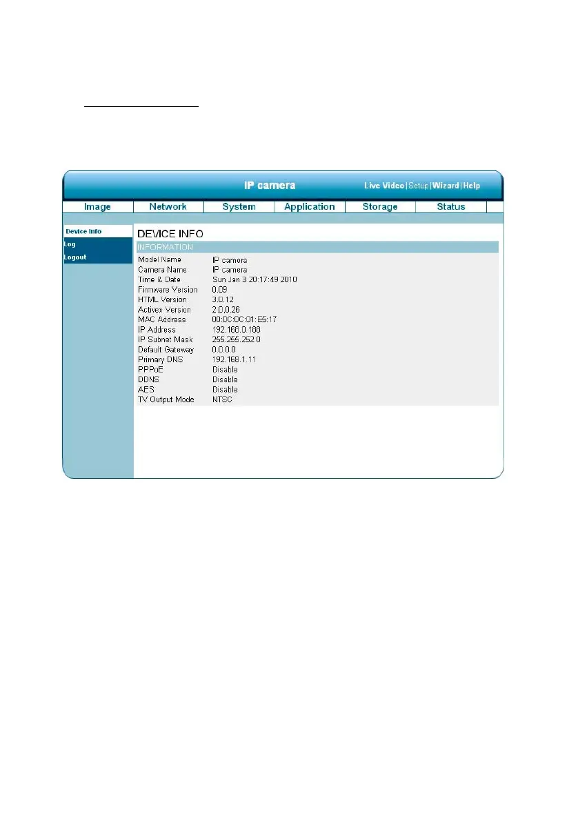 Click on the “Device info” button of the Status page to enter the “Device info” screen.