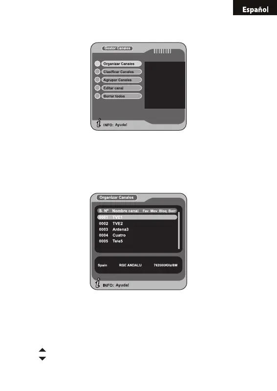 El menú del organizador de canales incluye: canal favorito, borrar canal,