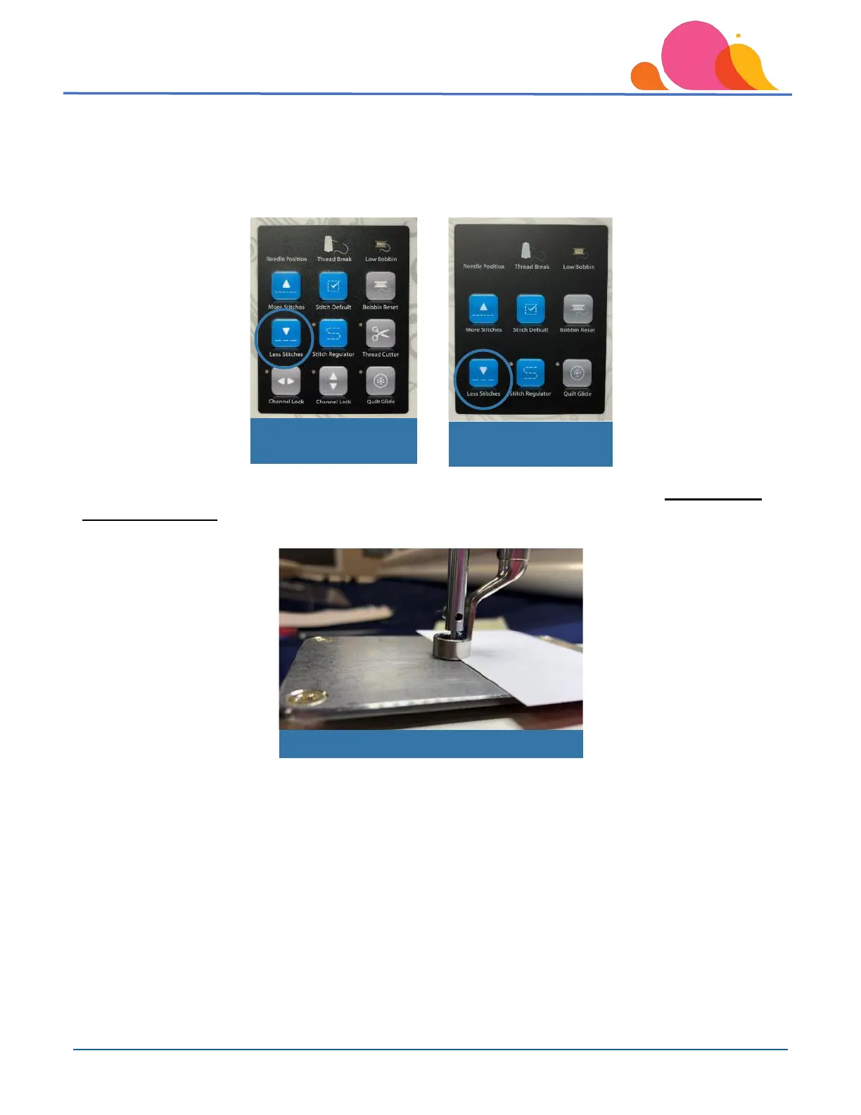 correct this problem, adjust the sewing motor speed in manual mode using the touch panel ‘Less Stitches” button. You