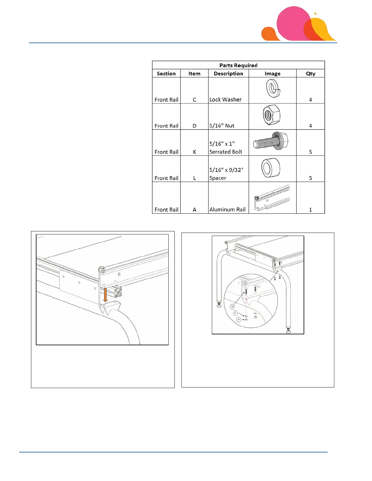 washer (C) and nut (D) to each rail mounting