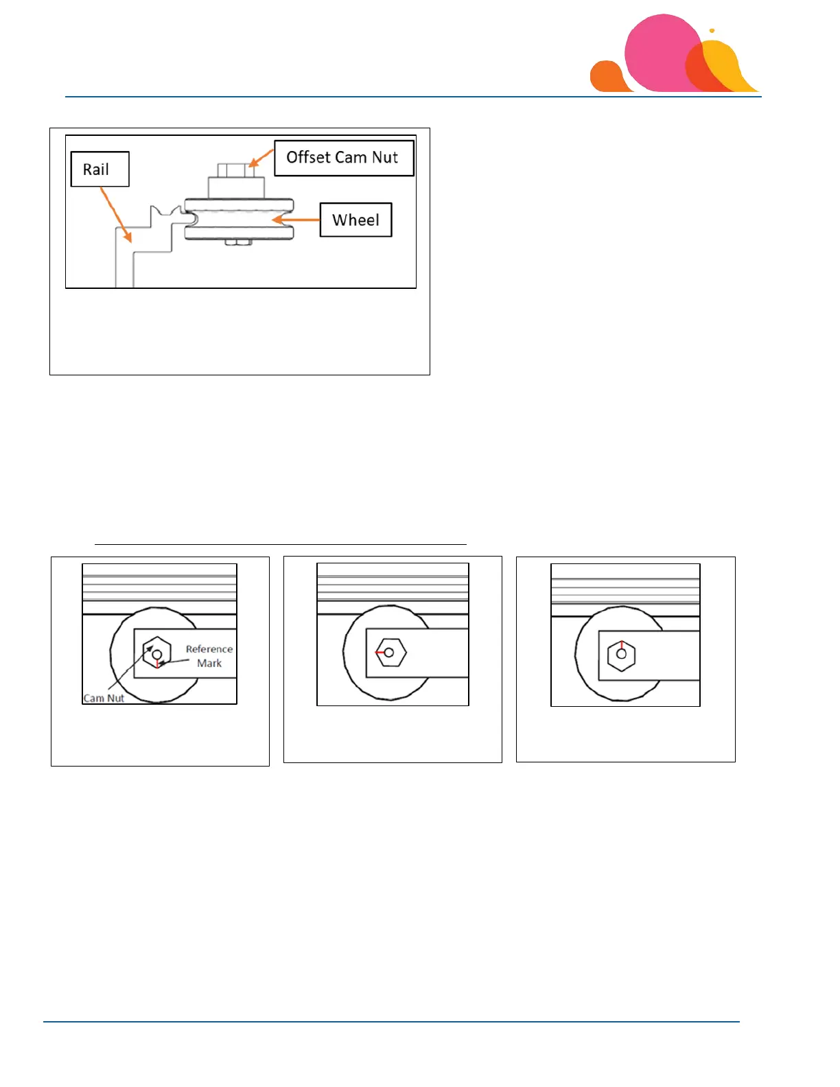 Rotating the cam nut makes the wheel move closer or farther away from the rail. Note the reference mark on the cam