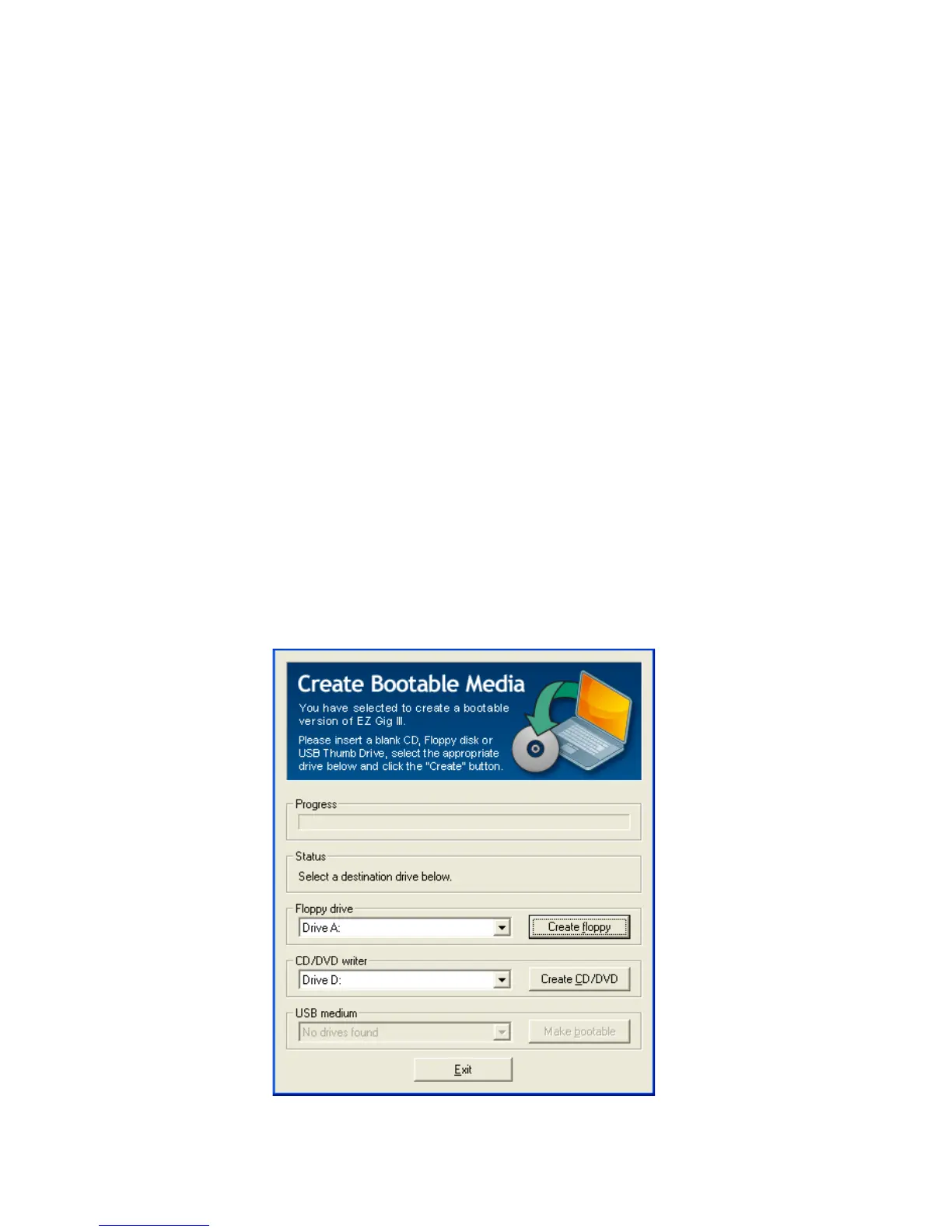 of creating a bootable EZ Gig CD, oppy disk or thumb drive to use in
