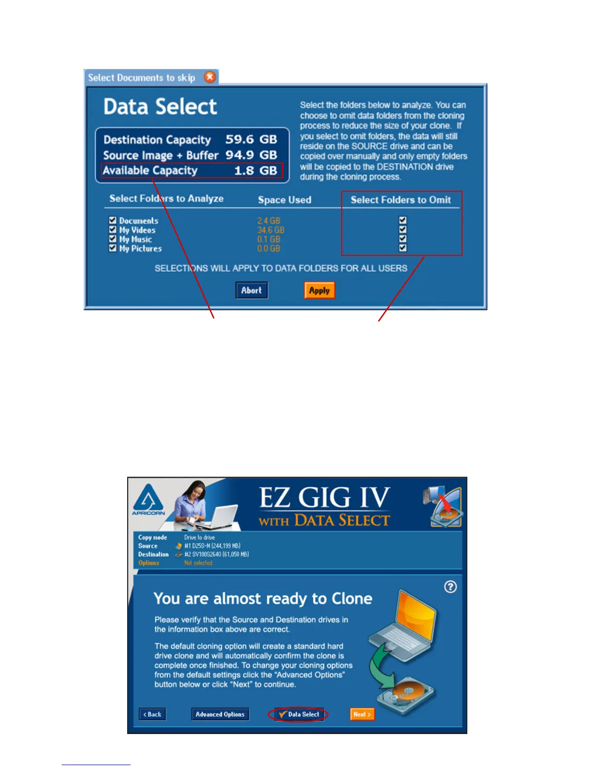 ready to Clone” screen. The Data Select button will have a check mark to the