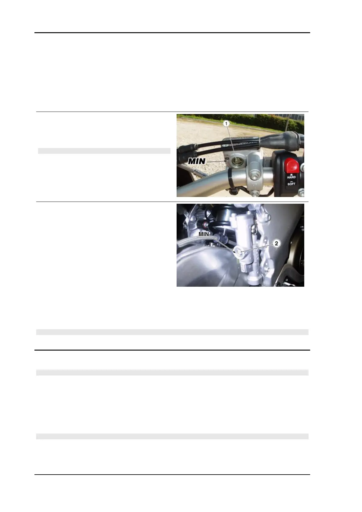 Make sure the fluid level in the reservoir (1) is above the 'MIN' level reference mark.