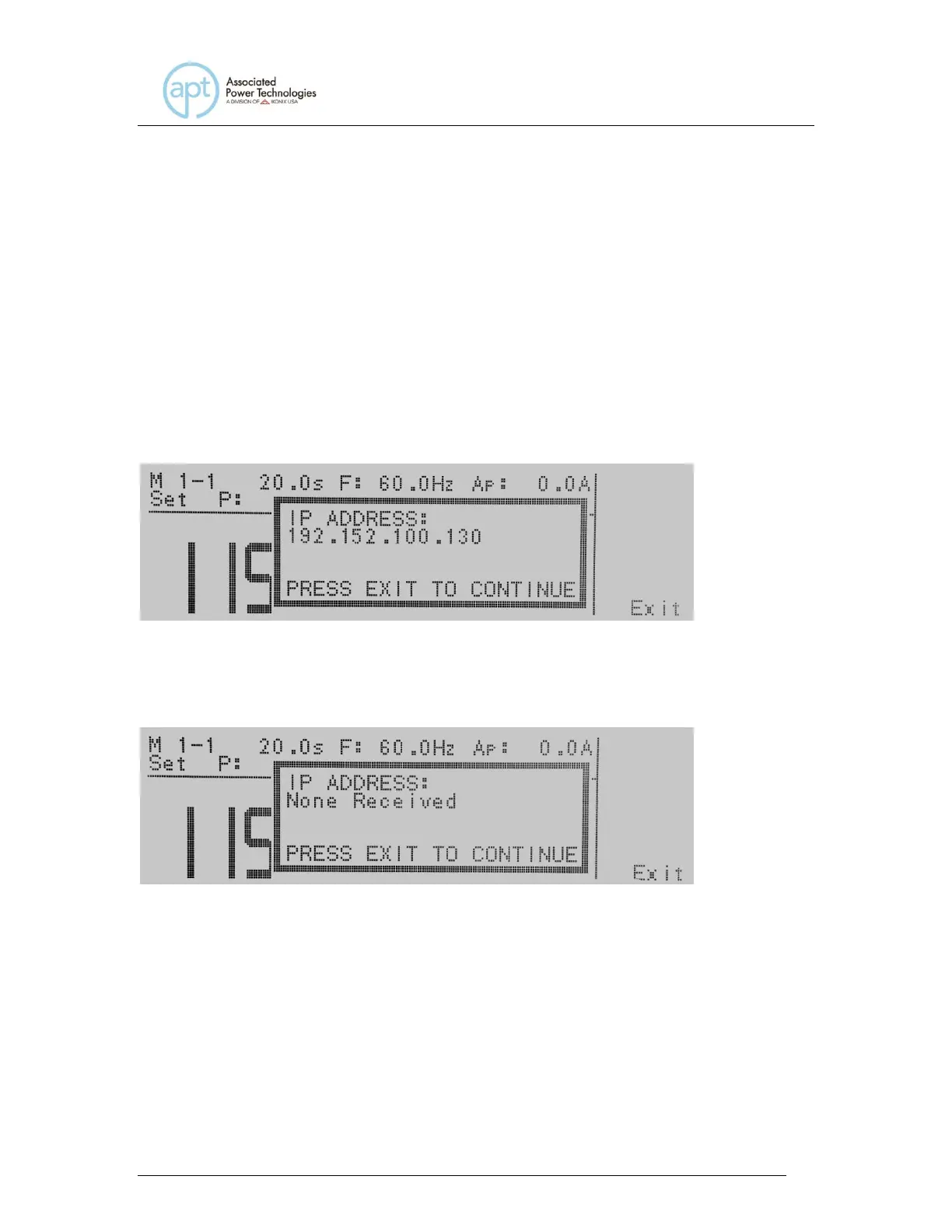 Press the Exit soft key to remove the pop-up message and return to the APT