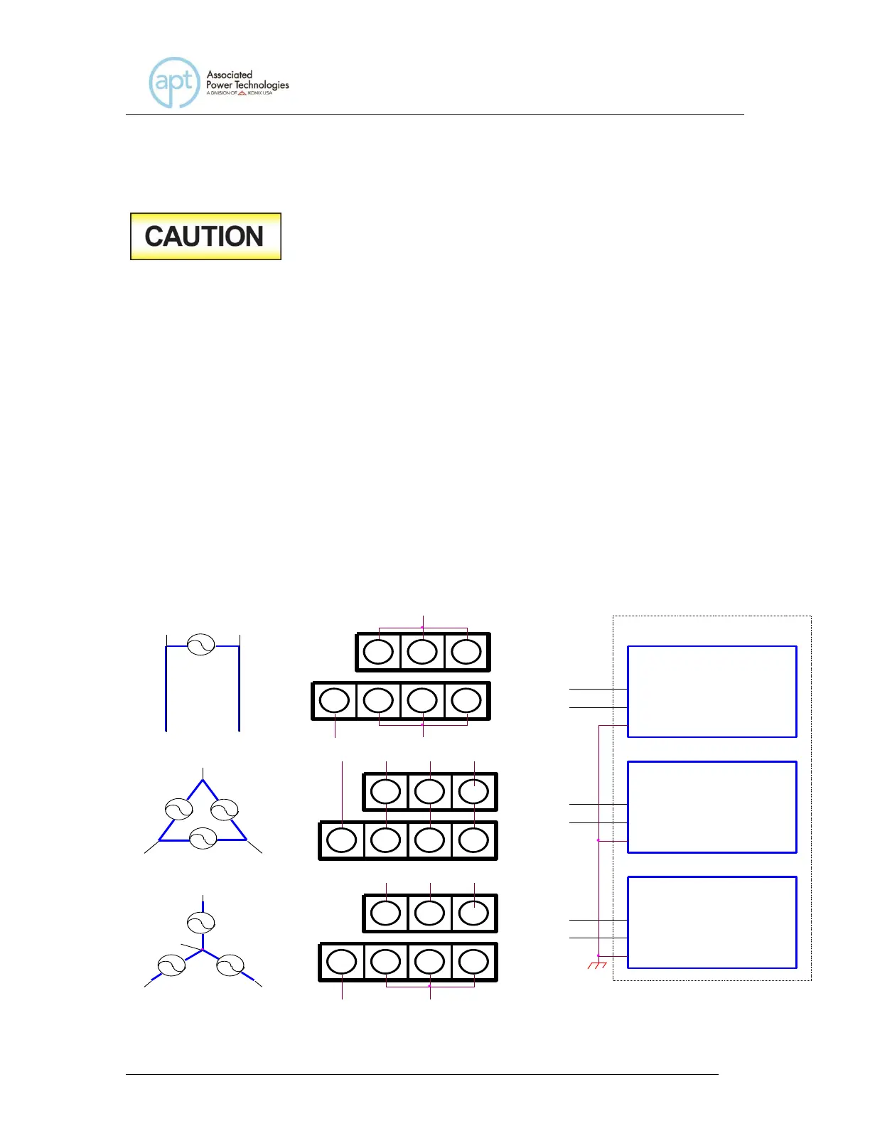 Refer to the diagram below for connecting a single phase, 3 phase wye, and 3