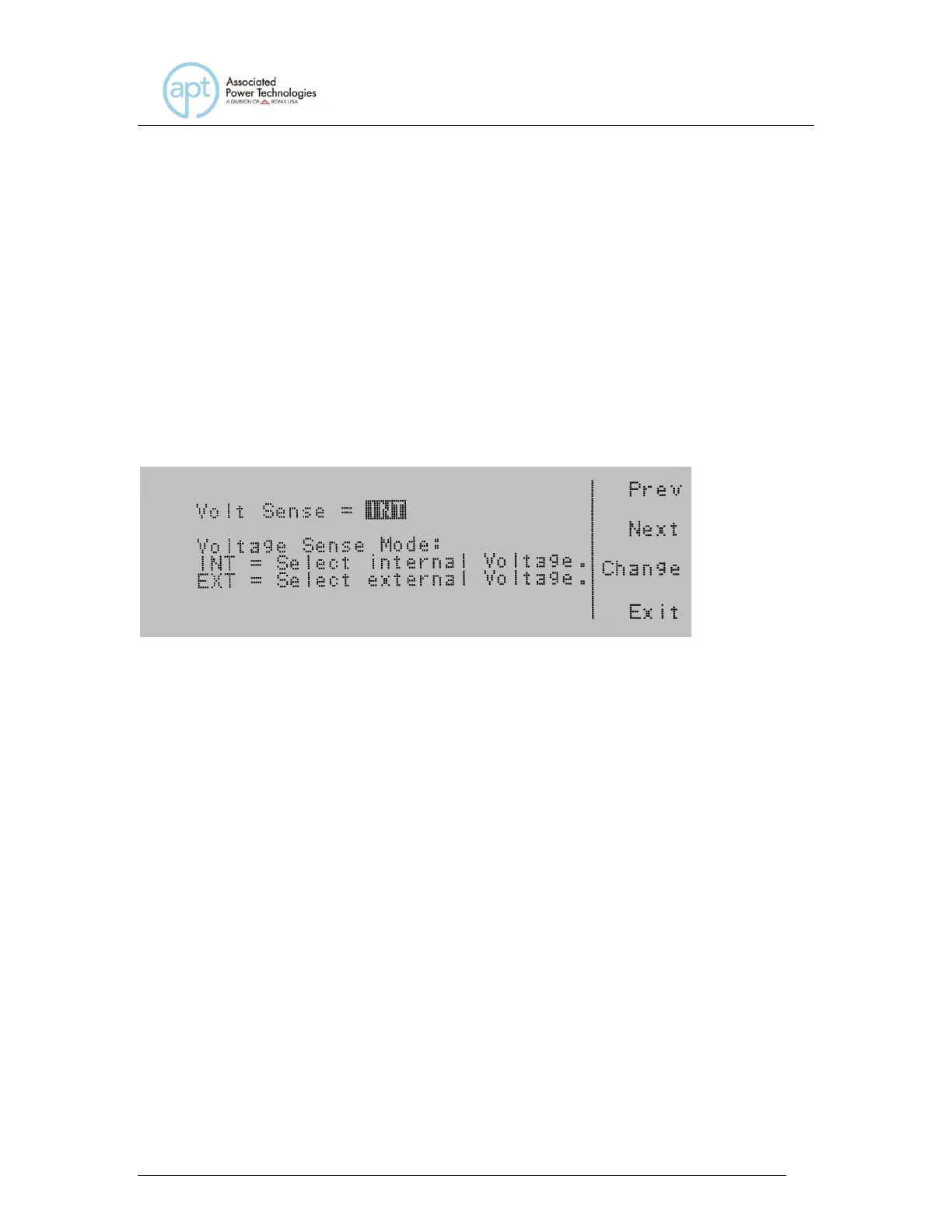 The Volt Sense Modes available are INT and EXT. Press the Change soft key to